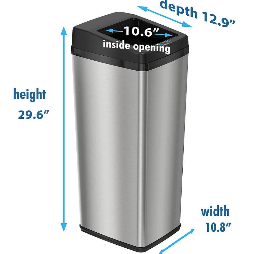 | Capacity in Gallons Trash can or recycling bin features. For example: molded hand grips, wide rim, step on, touchless | 100% Touch-Free Sensor Operation,Battery-Free Operation With Optional Ac Adapter |