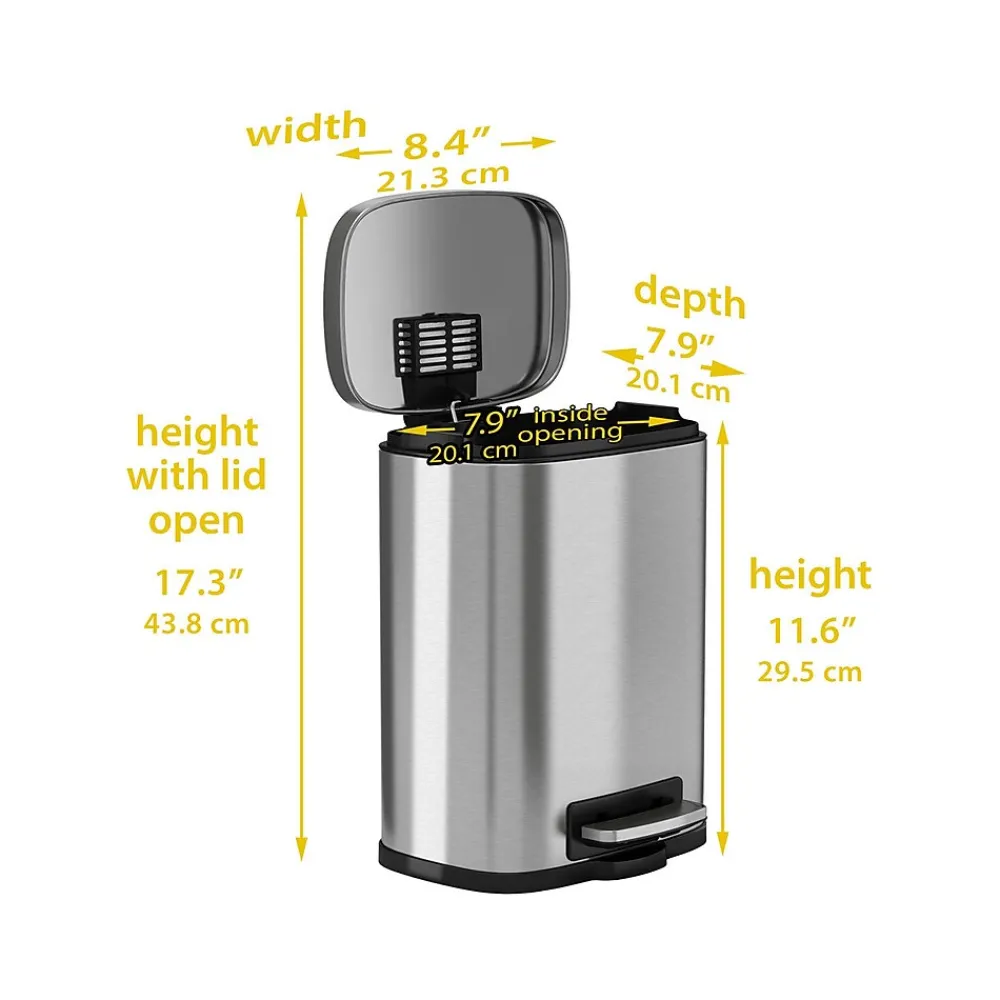 Offer quick and convenient waste disposal with the HLS Commercial attractive and durable 1.32 gal. stainless steel step trash can. The smooth and easy pedal that requires minimal effort is coupled with a soft and silent lid close. The replaceable odor filter keeps the surrounding area smelling fresh and clean. Emptying the trash is quick and clean with the removable inner bin. The elegant stainless steel complements any decor, while the slim shape saves space.
