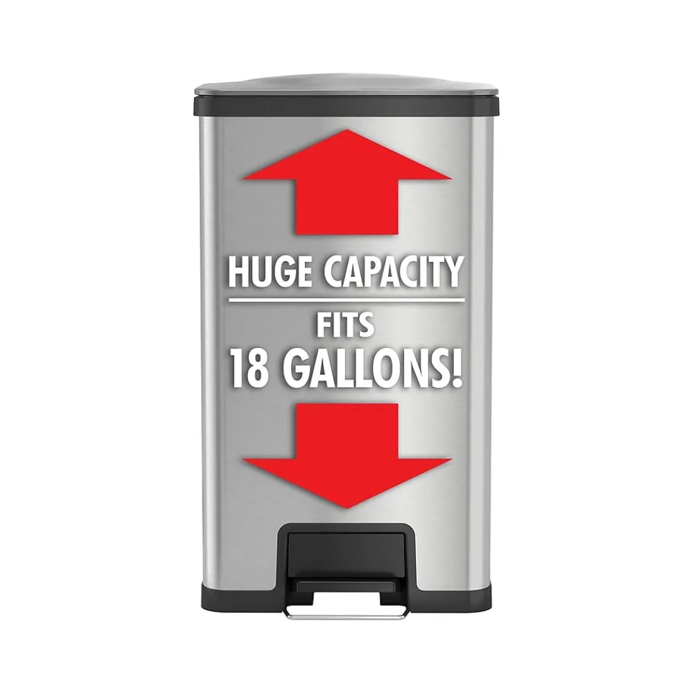 The HLS Commercial 18-gallon step trash can with AirStep technology is a stunningly sophisticated step trash can. From the low-effort, ergonomic step-activated open to the gentle, silent close, this trash can offers amazing reliability and consistently pleasing appearance. The pedal has been designed to perform perfectly for over 200000 steps, which is years of rigorous daily use. Designed for maximum space efficiency, the can provides 25% more capacity than comparably sized trash cans.