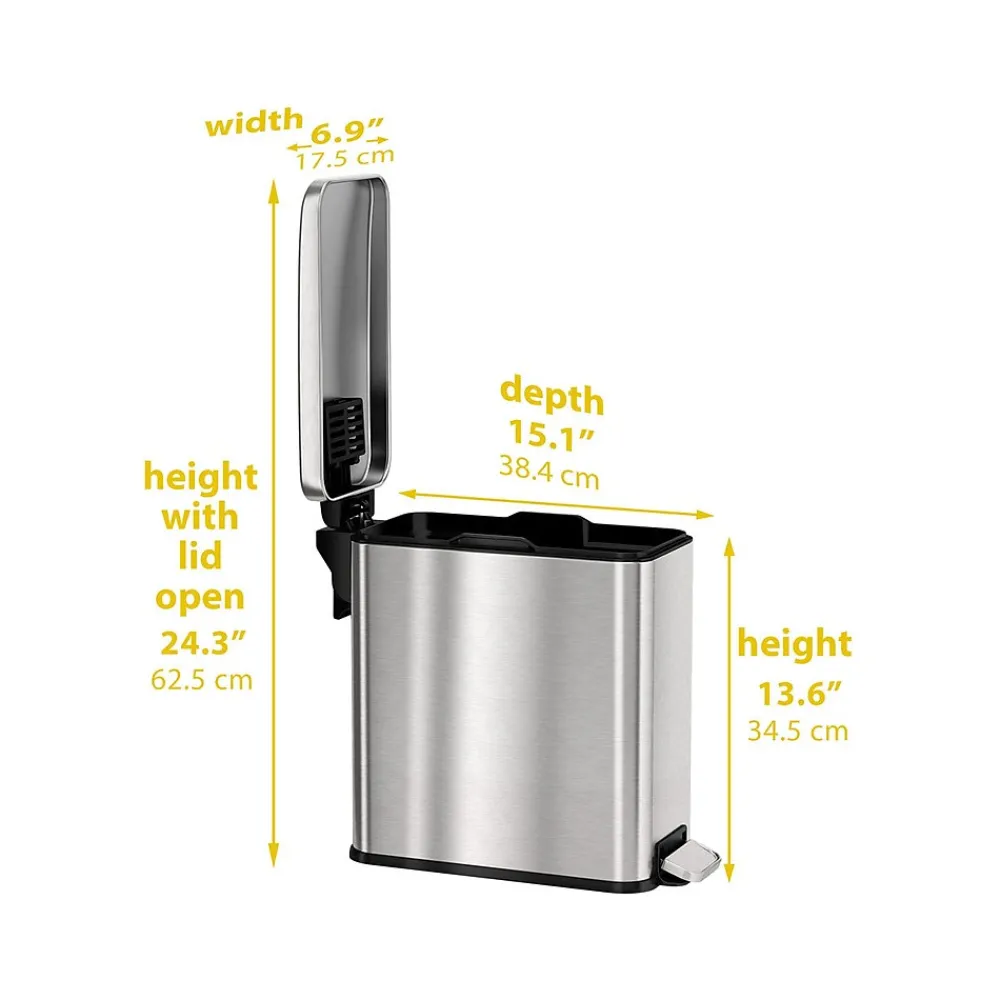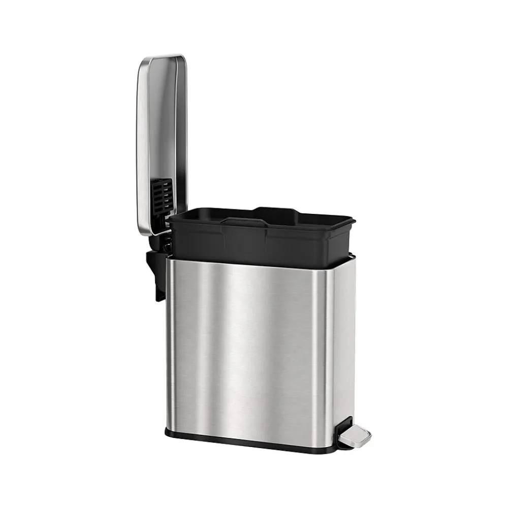 FM Approvals tested and certified, this HLS Commercial 3 gal. trash can provides the compliance, protection, and style you need and want in your facilities. Bin fires are quickly extinguished with the special fire-retardant liner material and a tight lid design that restricts airflow to the interior, starving the flame of necessary oxygen. Designed to be as aesthetically pleasing as it is safe and easy to use, the elegant stainless steel bin complements any decor. The smooth and easy pedal requires minimal effort and is coupled with a soft and silent lid close. Emptying the trash and recycling is quick and clean with the removable color-coded inner buckets.