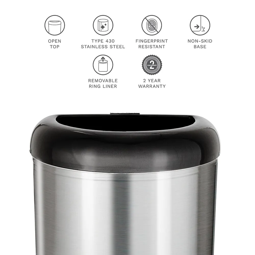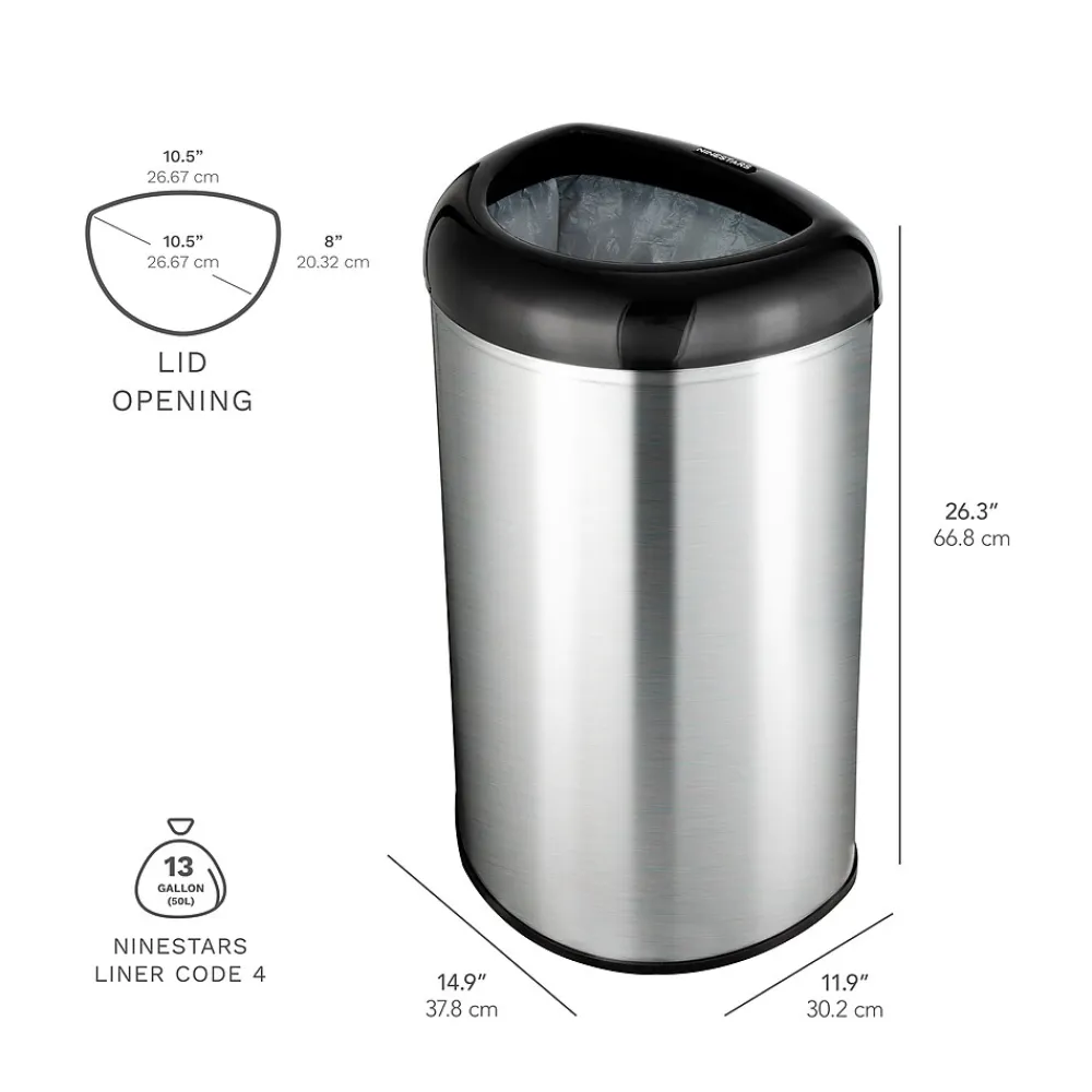 The Nine Stars 13.2-Gallon Open Top Trash Can is ideal for your kitchen, office, or breakroom. It uses 13-gal trash bags This fingerprint-resistant stainless steel trash can features a non-skid base and open top design. Stylish and functional, it offers a practical solution to your garbage needs. Also included is a ring liner to hold trash bag up and conceal with in trashcan. A practical solution to your garbage needs. Also included is a ring liner to hold trash bag up and conceal with in trashcan.
