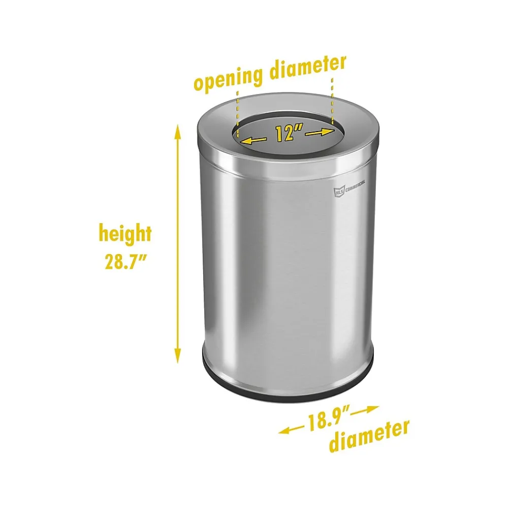 The HLS Commercial 26 gal. stainless steel round trash can is a perfect waste receptacle for high-traffic areas such as restrooms, lobbies, hallways, and conference rooms. This receptacle features an easy-to-access galvanized steel inner bucket with handles. The opening is 12″Dia., making it easy to dispose of bulky trash on the go. The round profile is space-efficient and versatile. The brushed stainless steel body is fingerprint-proof, smudge-resistant, and easy to clean.