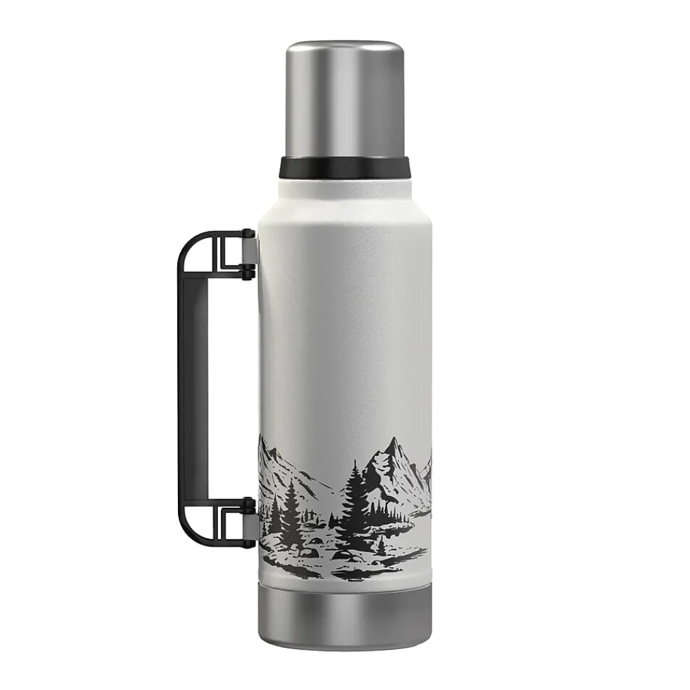 The Outdoors Professional White Mountains 33.8-Oz. Termo Classic Vacuum Bottle with Carry Handle is made with superior insulation that keeps liquids (soup, coffee, tea) hot for up to 24 hours or cold drinks cool for up to 24 hours. Add ice to your favorite beverage and the Termo classic will keep it cold for up to 5 days. The rustproof stainless steel construction means it can work just as hard as you do without impacting its performance. This is an ideal bottle to throw in your truck, work bag, or travel with it. It’s made with BPA-free materials, keeping its contents safe to consume. This 1-L bottle features a leak-resistant lid, so you can put it in your backpack without worrying about any spills. The wide mouth opening helps with easy pouring into the lid that doubles as a cup. The collapsible handle makes it easy to transport when you’re on the go.