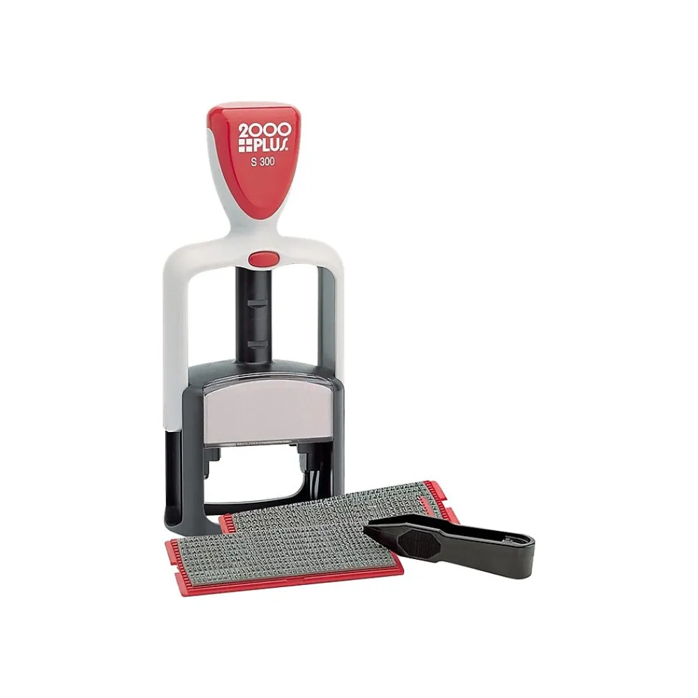 Create custom stamps and process documents quickly with this stamp printer kit. The seven-line template offers plenty of space for personal messages, and three included sets of characters provide enough letters to write in full sentences. This 2000 Plus S 300 self-inking stamp printer kit includes a set of tweezers that make it easy to add and remove characters from custom stamps.
