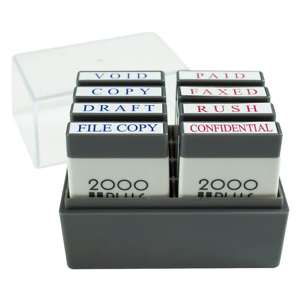 Keep these stamps neatly organized in the included caddy. The clear lid helps ensure secure transport and it lets you quickly see which items are inside. These Cosco pre-inked stamps have blue and red ink that’s easy to see on light-colored documents.