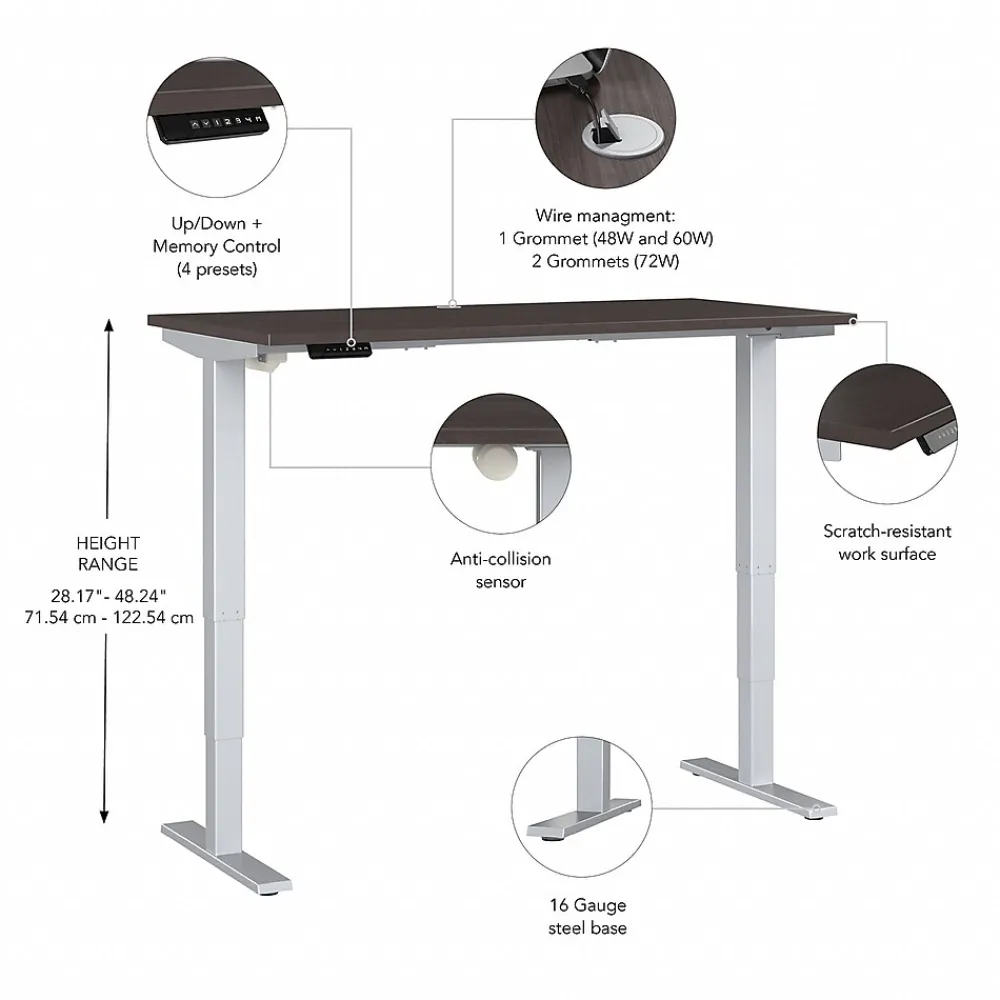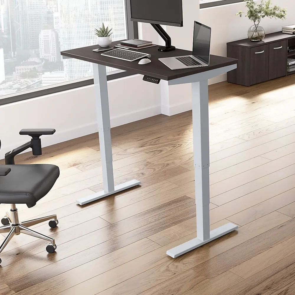Bush Business Furniture’s Move 40 Series Electric Height Adjustable Standing Desk is a perfect way to build an ergonomic workspace without the high-end price tag. The 48W x 24D desktop lifts anywhere from 28 to 48 inches from the floor at a speed of 1.25 inches per second. The control panel includes four programmable presets that save your favorite heights so you can change positions without missing a beat. The Adjustable Desk also features an Anti-Collision Sensor that stops movement up or down if an object is detected. Built to endure the rigors of a busy professional environment, the thermally fused laminate work surface resists scratches and stains while a welded 16-gauge steel base allows the desktop to support up to 176 pounds. This Ergonomic Office Desk has been tested to meet or exceed ANSI/BIFMA standards for safety, durability and performance and is backed by a 5 Year Warranty.