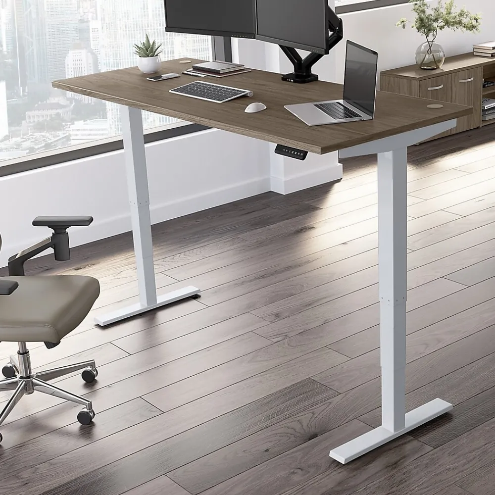 Bush Business Furniture’s Move 40 Series Electric Height Adjustable Standing Desk is a perfect way to build an ergonomic workspace without the high-end price tag. The 72W x 30D desktop lifts anywhere from 28 to 48 inches from the floor at a speed of 1.25 inches per second. The control panel includes four programmable presets that save your favorite heights so you can change positions without missing a beat. The Adjustable Desk also features an Anti-Collision Sensor that stops movement up or down if an object is detected. Built to endure the rigors of a busy professional environment, the thermally fused laminate work surface resists scratches and stains while a welded 16-gauge steel base allows the desktop to support up to 176 pounds. This Ergonomic Office Desk has been tested to meet or exceed ANSI/BIFMA standards for safety, durability and performance and is backed by a 5 Year Warranty.