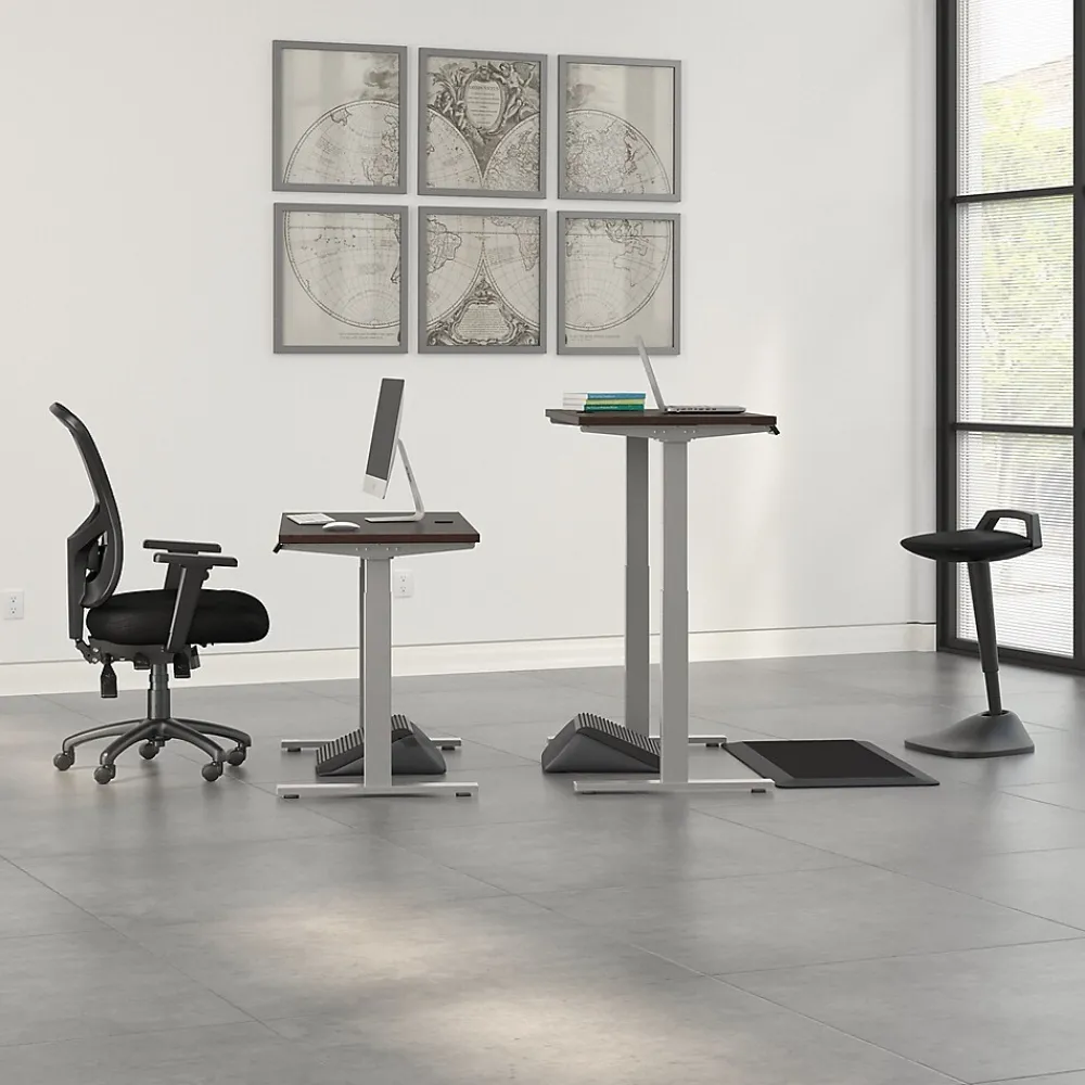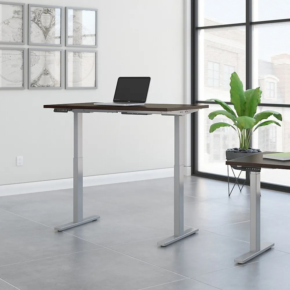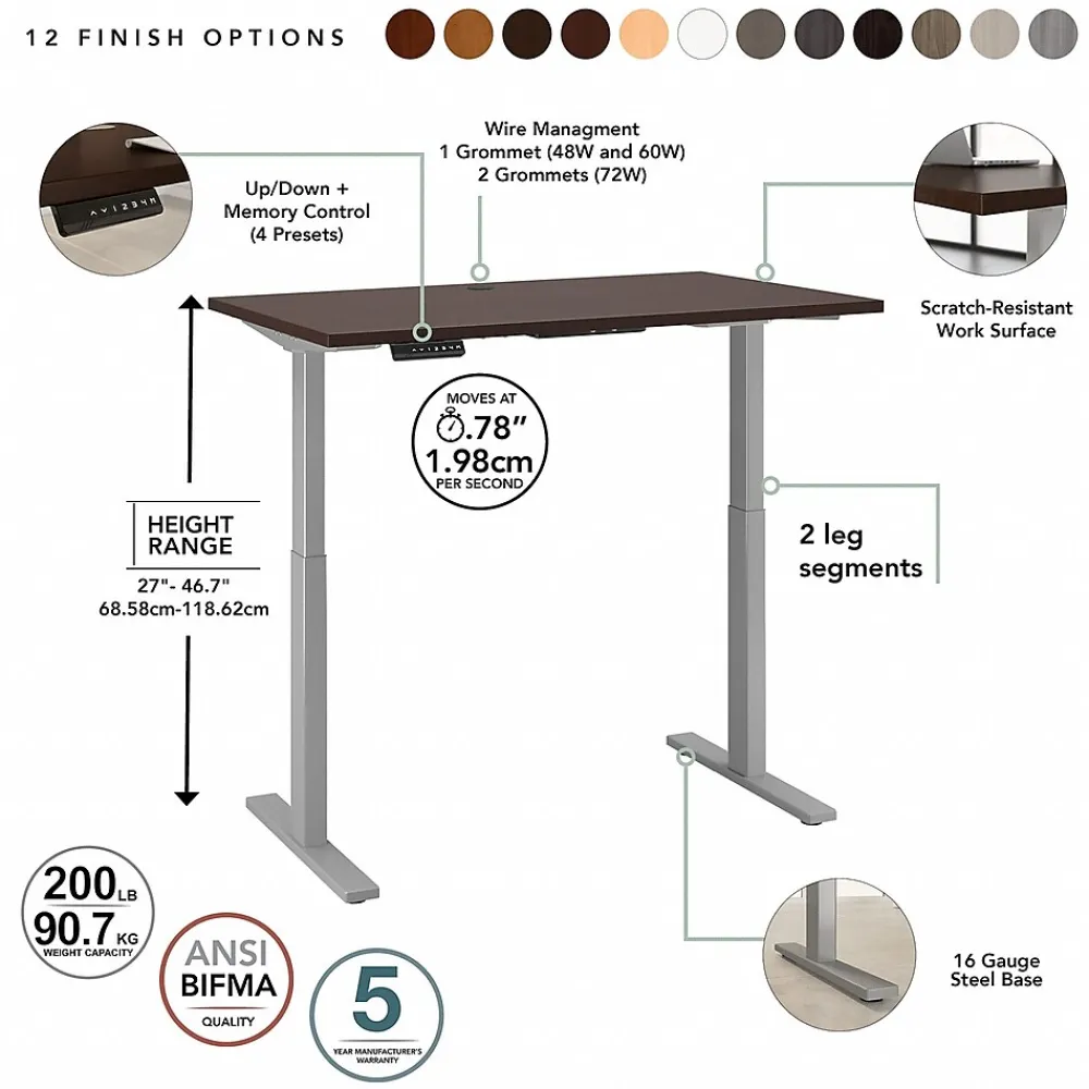 Have a healthy and productive day at the office with the Move 60 by Bush Business Furniture 48W x 24D Height Adjustable Standing Desk. Those who use sit to stand desks report improved attitudes, energy and comfort while getting more done, and the Move 60 provides an affordable solution. The electric adjustable height Desk smoothly lifts from a low of 27 inches to a high of 46.7 at the push of a button. Store your favorite heights with four programmable presets. The ergonomic Desk withstands years of everyday use. A durable thermally fused laminate finish resists scratches and stains, while the sturdy steel base creates a weight capacity of up to 200 pounds. This sit to stand Desk will have no problem holding all of your work materials. Backed by a 5 Year Warranty, the Height Adjustable Standing Desk meets ANSI/BIFMA quality test standards.