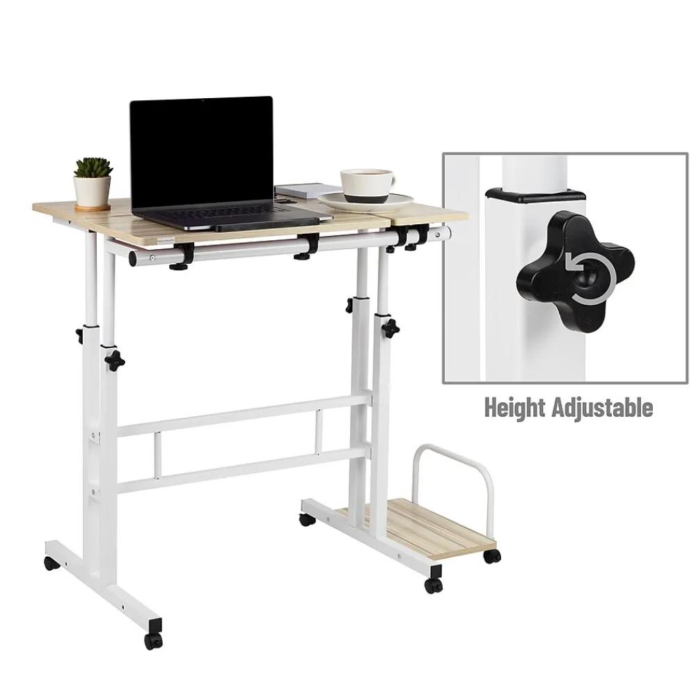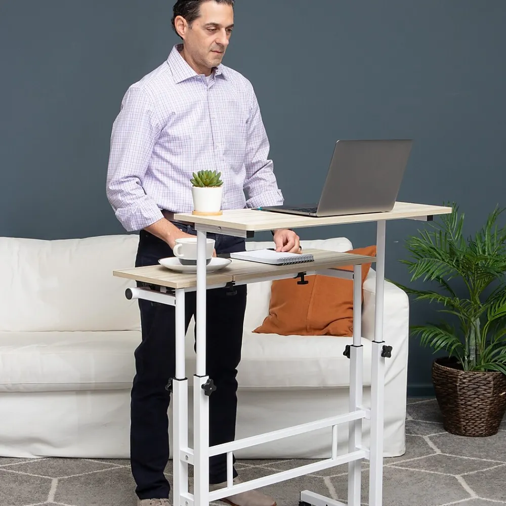 This versatile workstation adapts to your workday and lifestyle. This innovative two-tiered desk offers the flexibility to sit or stand while working and provides ample space for other items. The adjustable desktop allows you to work at the perfect height, making it ideal for a variety of tasks.Despite its sturdy construction, this mobile desk is easy to move, thanks to the four lockable casters. With dimensions of 38 inches long, 21.25 inches wide, and an adjustable height from 27.5 to 45.25 inches, this desk is perfect for any work or study space.Made of durable MDF and metal, the Woodland Collection Mobile Sit/Stand Desk is built to withstand daily use and is easy to clean with a soft cloth and mild soap. A thoughtful gift for college students or remote workers, this flexible workstation is the perfect addition to any home or office.Embrace a dynamic work lifestyle with the Woodland Collection Mobile Sit/Stand Desk – your one-stop solution for a comfortable and efficient workspace.
