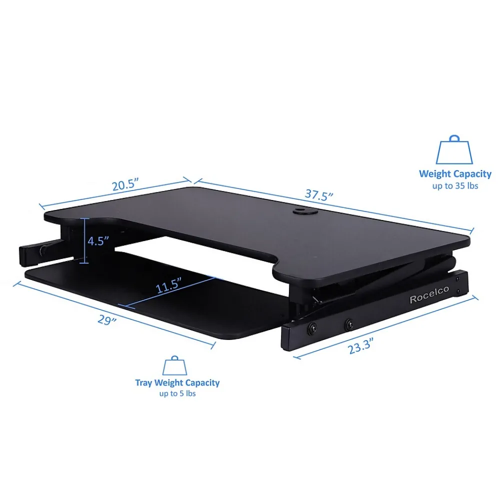 - Retractable ergonomic keyboard tray: Keyboard tray extends and retracts while keeping a 4.5″ spacing between keyboard tray and desktop which helps keep arms and wrists in an ergonomic position to prevent neck and back strain while sitting or standing.