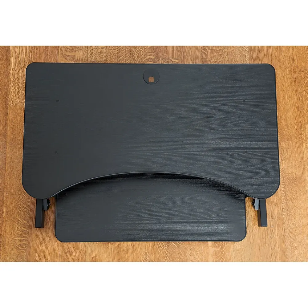 Enjoy the health benefits using this Deluxe Sit-to-Stand Adjustable Desk Riser, DADR. The desk top is extra large, 37.5″ x 20.5″, comfortably holding 2-3 monitors and a laptop. Easy to use handles on the side allows continuous height adjustment from 5″ up to 17″.A retractable keyboard tray offers the ergonomically correct position whether you’re sitting or standing.