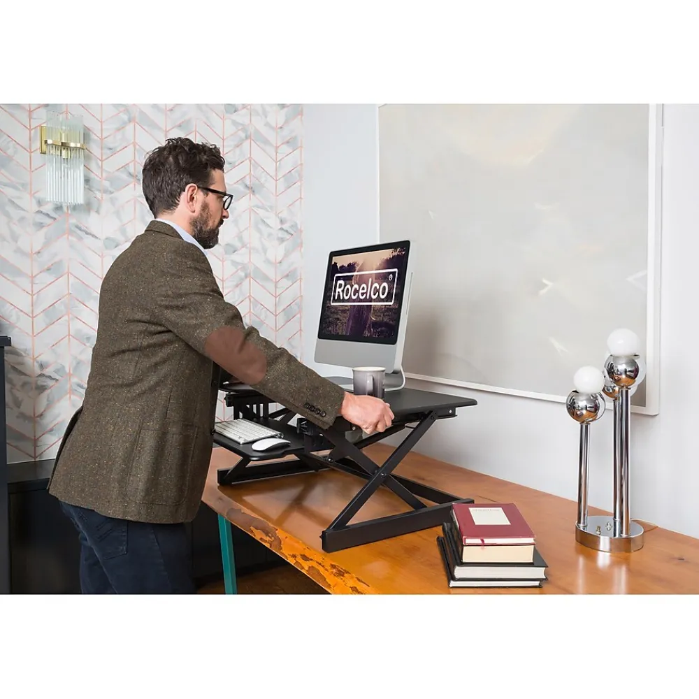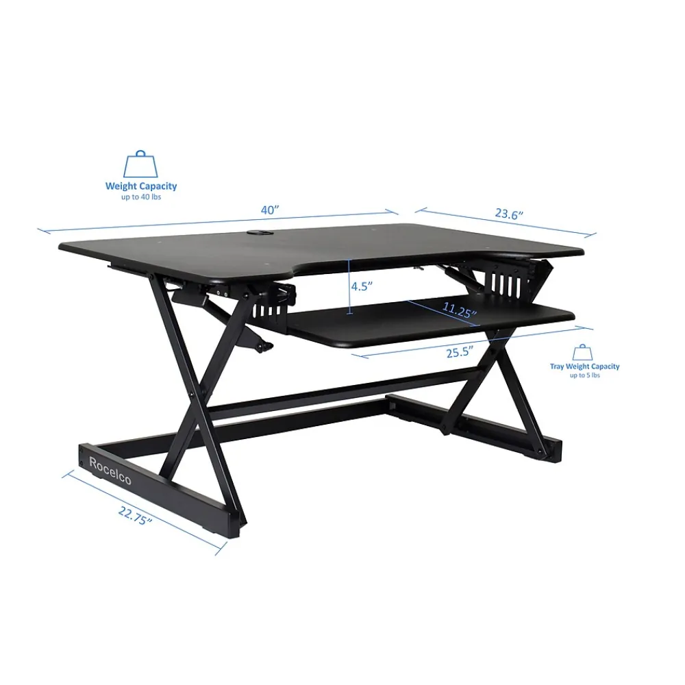 The R DADRB-40 standing desk converter now optimizes your ergonomic work position with Enhanced Vertical Range, which seamlessly raises your tabletop up to 20″ and lowers it down to 5″. The large 40″ x 23.5″ desktop can hold up to two screens along with other small accessories. Its full size 25.5″ x 11.25″ retractable keyboard tray holds a laptop or keyboard as well as a mouse. It’s convenient grommet hole provides a hassle free cable management system or can be used to install a monitor mount (R DM2) to maximize desk space efficiency. This sturdy adjustable workstation arrives fully assembled with nonskid pads to protect your desk from scratches. The black laminated finish will complement any color scheme.