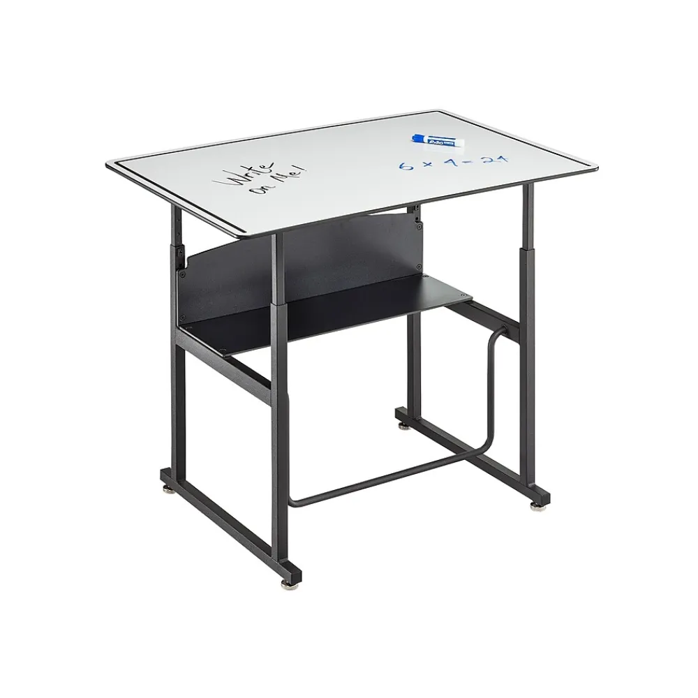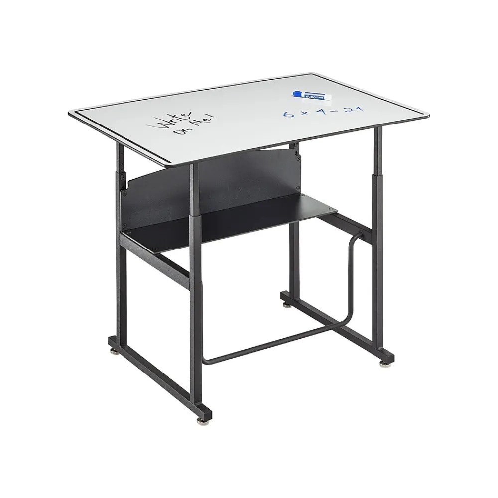 Safco AlphaBetter is an adjustable-height stand-up student desk with swinging footrest (fidget bar). Patented Swinging Pendulum footrest bar allows students to redirect excess energy and engage in continuous motion that may help support ergonomic comfort and cardiovascular health, while potentially increasing calorie burn, productivity, and focus. The desktop is large enough to accommodate laptops, textbooks, and supplies for project learning. The desk features adjustable nylon base levelers for stabilization and easy movement across smooth and carpeted floors. Phenolic resin open shelf provides easily accessible storage area for school supplies and personal items.
