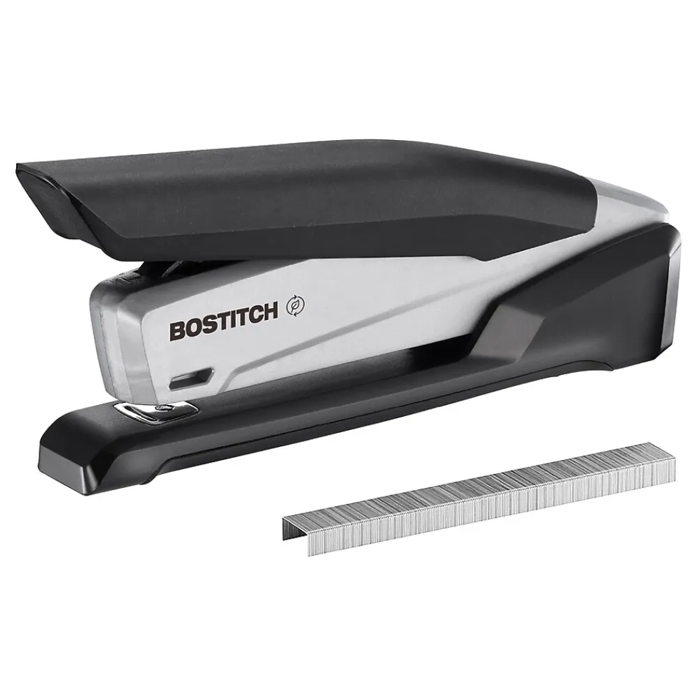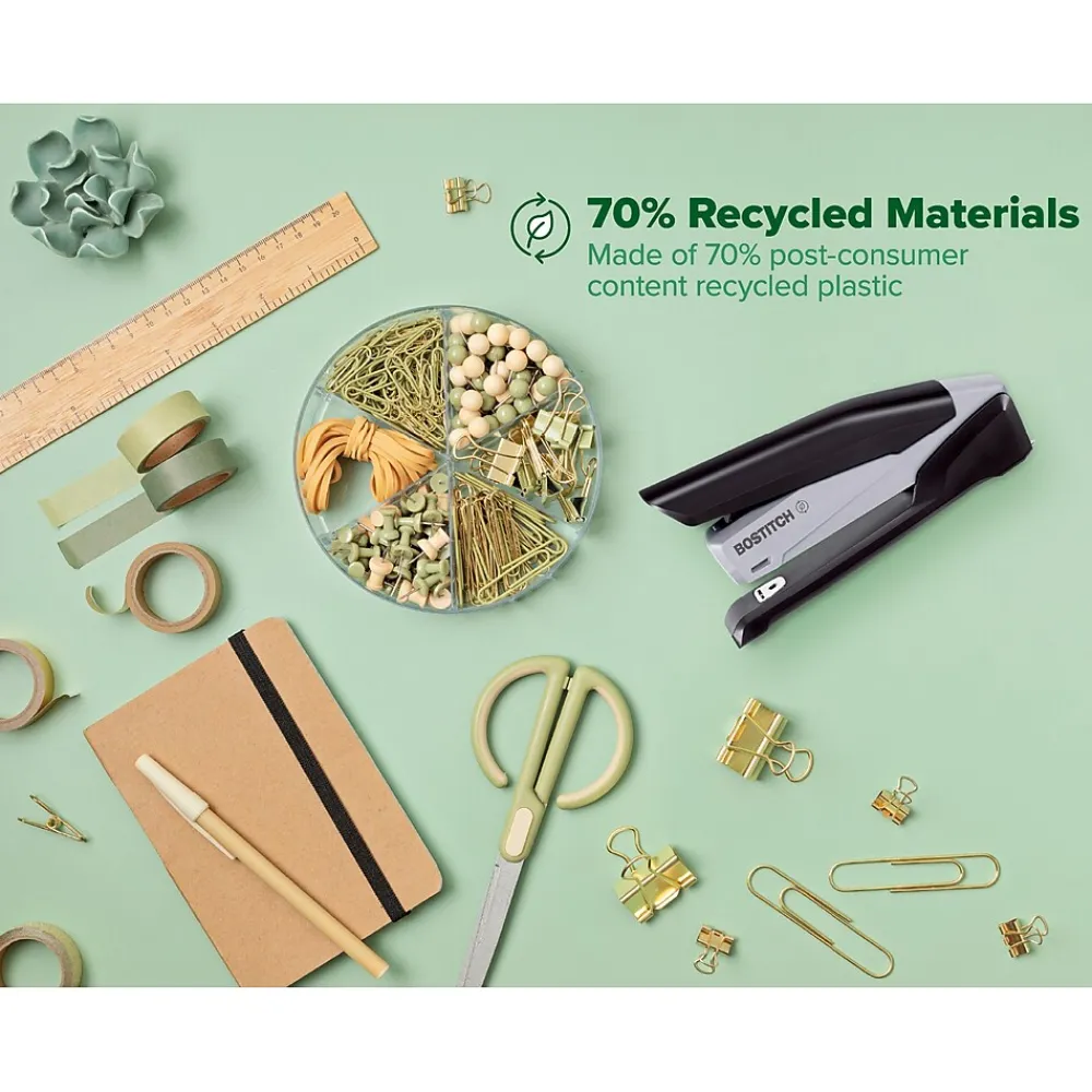Bostitch inPowerâ„¢ Eco-Friendly Stapler: Effortlessly bind documents with One-Finger Stapling Technology, crafted from 70% post-consumer recycled plastic. This sleek, durable stapler handles up to 25 sheets, reducing hand strain with its ergonomic design. Enjoy jam-free operation with standard staples and utilize it for bulletin board tacking, perfect for any workspace at home, school, or the office.
