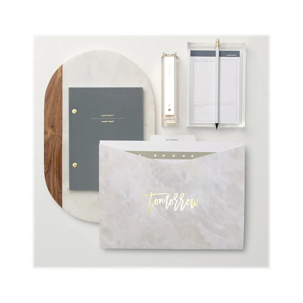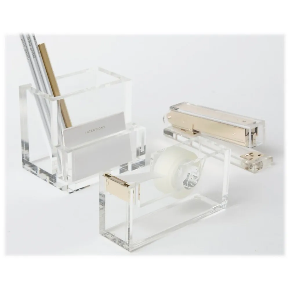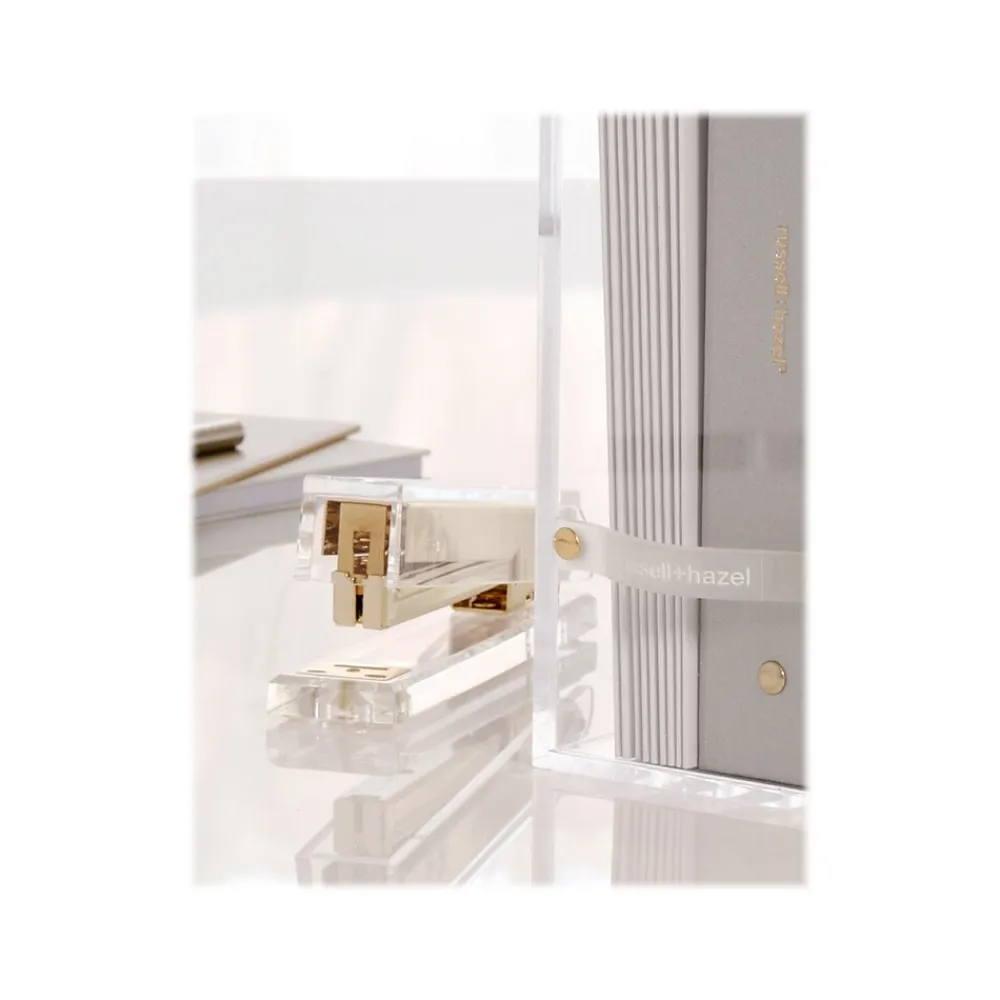 Heavy-cast clear acrylic combined with gold-toned hardware will lend a minimalist, contemporary aesthetic to your work desktop or home decor. The elegance and durability of this acrylic stapler are sure to enhance any workspace. The stapler features an easily refillable track and is designed to work with standard-size staples.