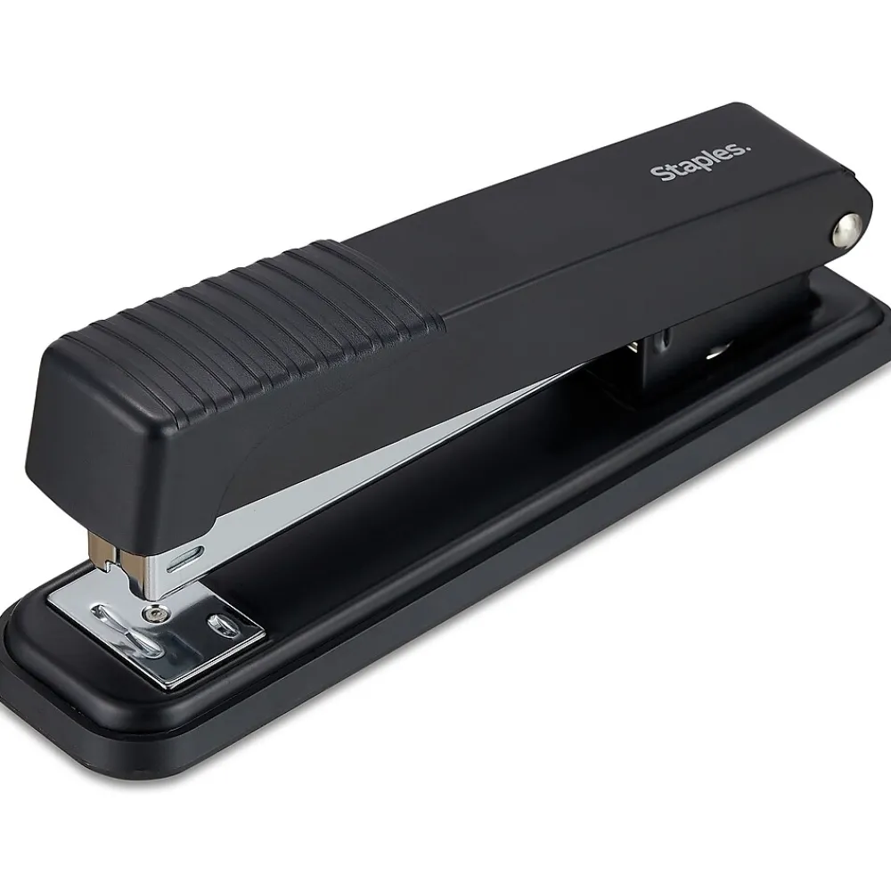 Hold papers with this desktop stapler. With a nonskid metal base, this stapler stays firmly in place, making it easier to operate, and the stapler is easy to open, so refilling is fast. This Staples stapler has a capacity of 20 sheets, so it’s a simple job to bind together large reports, articles, and other documents, while the smooth black plastic material provides a professional appearance.