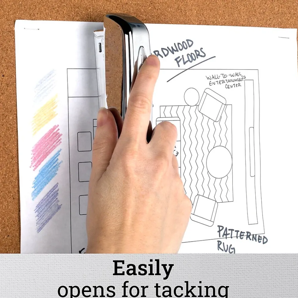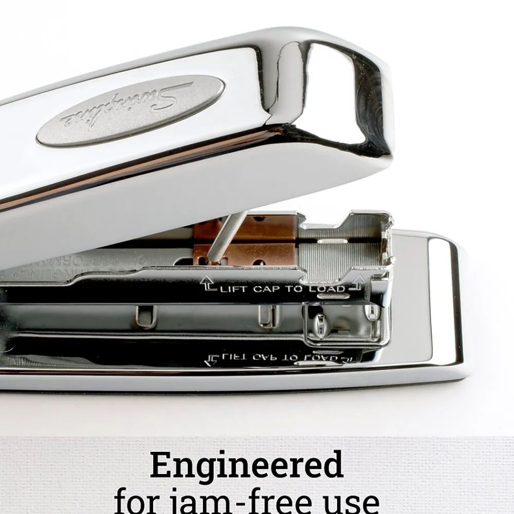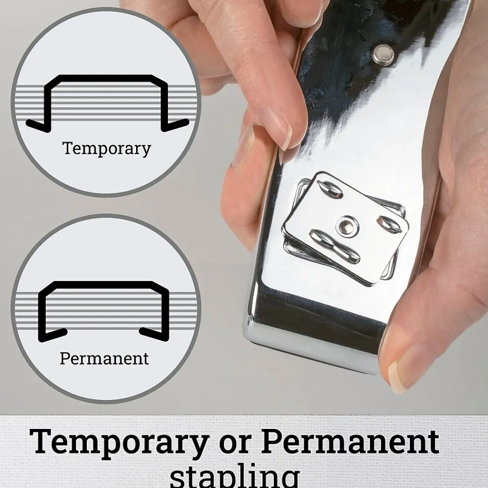 Eye-catching chrome over durable metal construction sets this stapler apart from the competition. More than just a sophisticated design, it provides reliable stapling performance. Capable of stapling up to 25 sheets at once with recommended staples this legendary 747 promises long-term stapling integrity. The specialized inner rail also stabilizes the stapler for jam resistant use. The stapler opens for tacking, and also has a reversible anvil to create pin staples for temporary fastening.