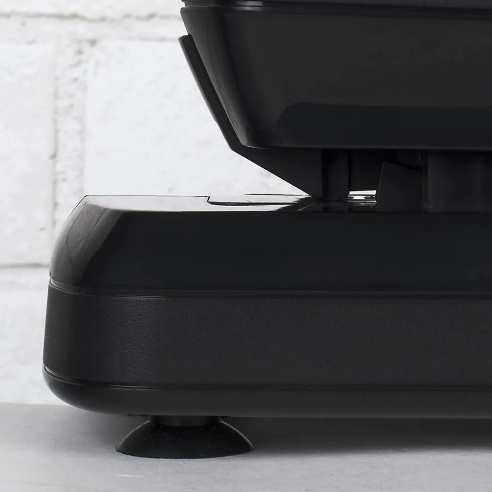 - A low staple indicator alerts when staples are running low and suction cup feet help hold the stapler in place