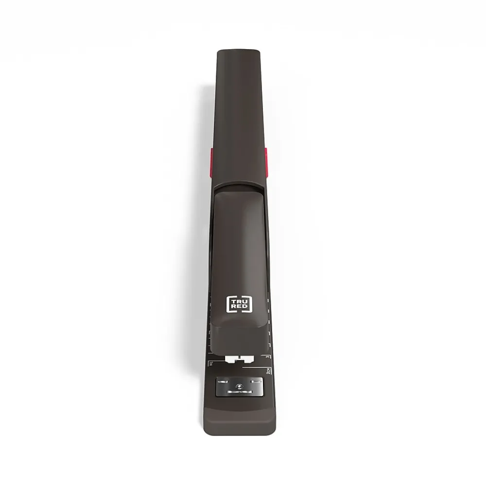 Outfit your office print station with this long-reach stapler. The rotary anvil lets you staple papers in standard mode and temporary mode, while the rubber feet deliver a firm nonslip grip for added safety. Know when it’s time to replenish the staples with the level indicator. This TRU RED long-reach stapler has a sliding paper guide for precise positioning.