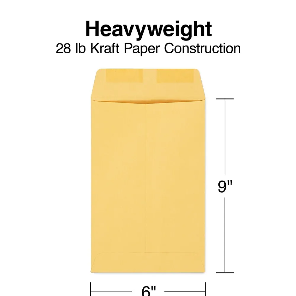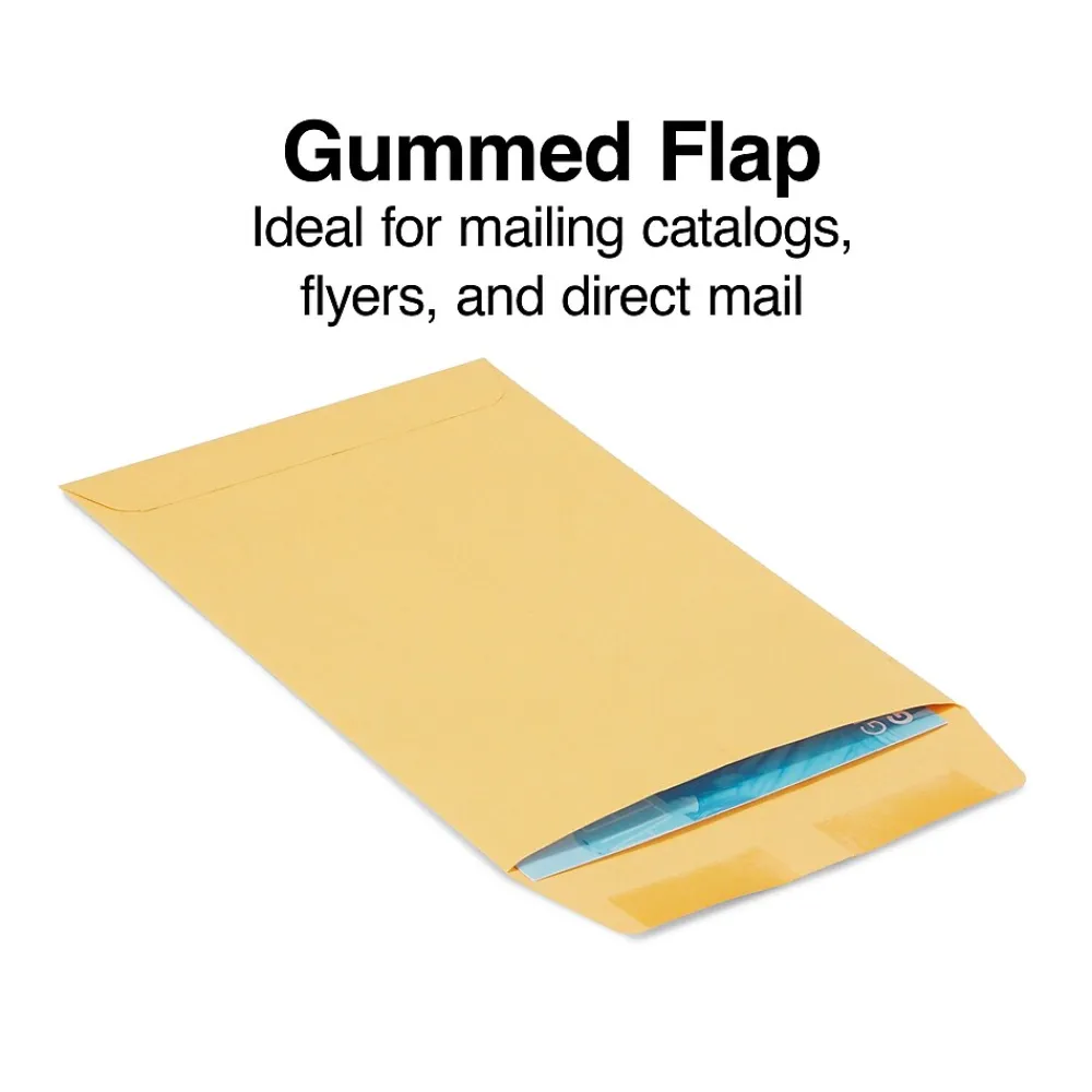 Ship brochures, diagrams and catalogs without bending them by using these brown kraft catalog envelopes. Each envelope features a heavily gummed flap that provides a strong seal once moistened, while the sturdy 28-pound kraft material helps resist ripping, bending and puncturing. These Staples gummed-closure catalog envelopes come 100 per box, so stocking up the supply cupboard is simple.
