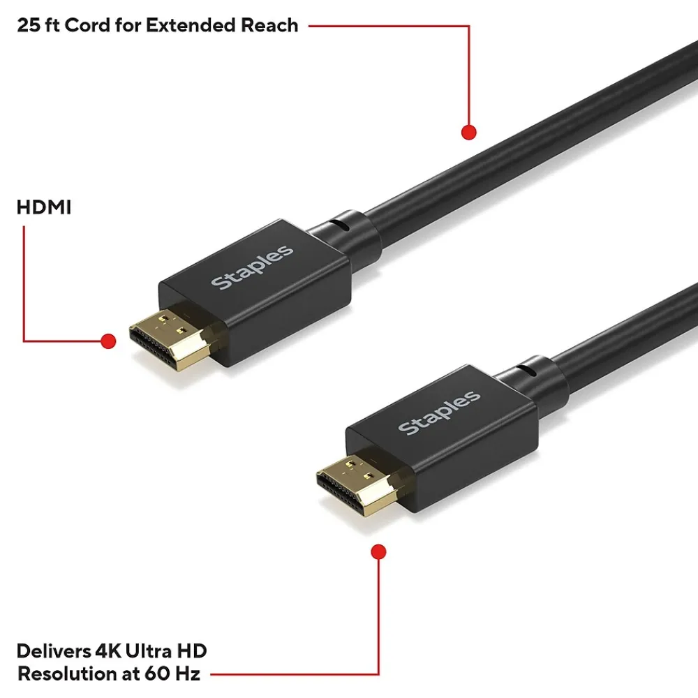 Delivering crisp 4K Ultra HD resolution this cable promises clear audio and video for an exceptional experience. Featuring a 25-foot cord, this cable provides you extra length to connect devices across the room. This cord is the perfect choice for outfitting your work, gaming or media space. Enjoy high resolution audio and video between devices so you can upgrade your home or office workspace and do your best work. Backed by Staples Brands 100% satisfaction guarantee, or your money back.