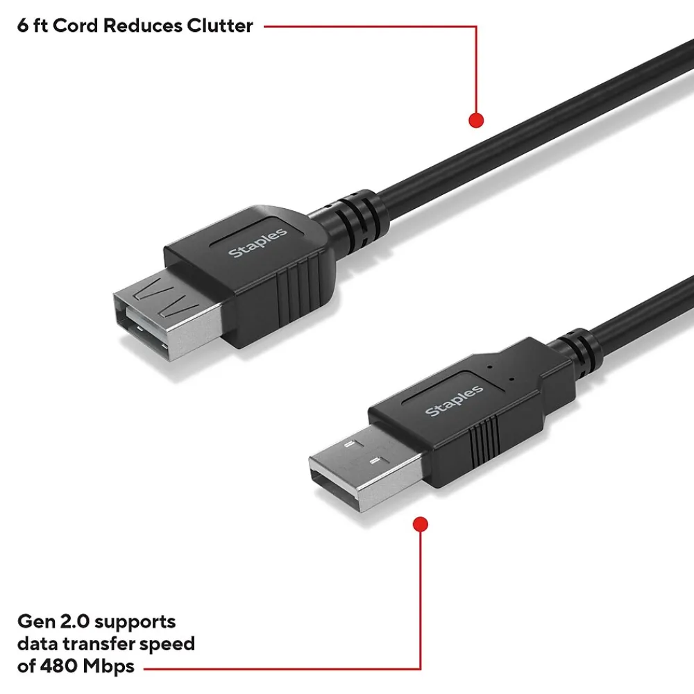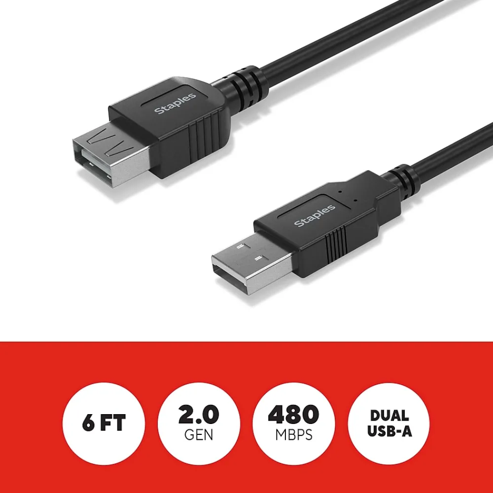 Reliably charge or sync personal electronic devices – like mice, keyboards, gaming headsets and more – with the Staples TECH USB-A cable. The 6-foot cable is compact to reduce cord clutter, and the USB 2.0 boasts high-speed data transfer speeds up to 480 Mbps. Keep your workday running smoothly with the Staples TECH USB-A cable. Backed by Staples Brands 100% satisfaction guarantee, or your money back.