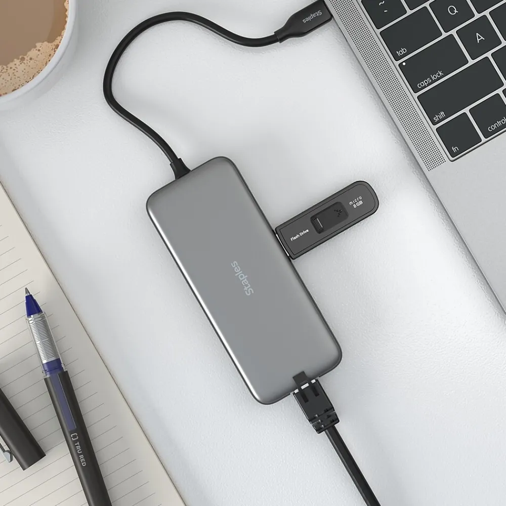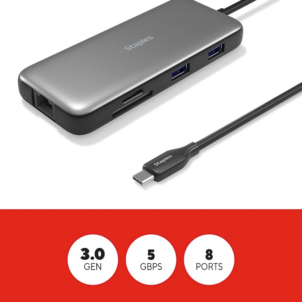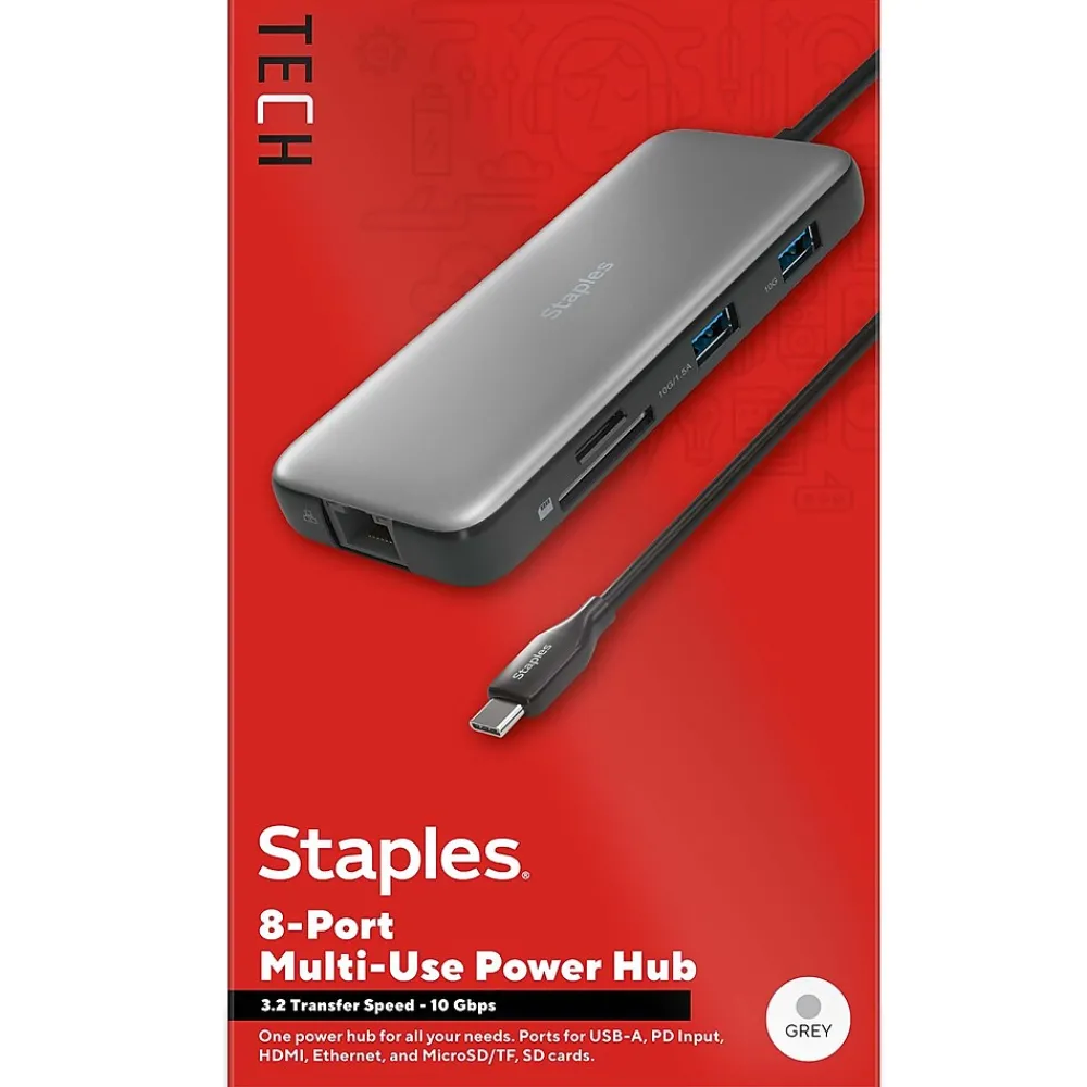 Enjoy a fully connected work space with the Staples TECH Eight Port Hub. Equipped with all the essentials – including USB-A, USB-C, HDMI, Ethernet, and ports for SD cards – this will be the only hub you need. Boasting Power Delivery and USB 3.2 technology this hub promises fast charging and high speed data transfer speeds up to 5 Gbps. Its compact design will fit neatly on your desk and reduce clutter. Backed by Staples Brands 100% satisfaction guarantee, or your money back.
