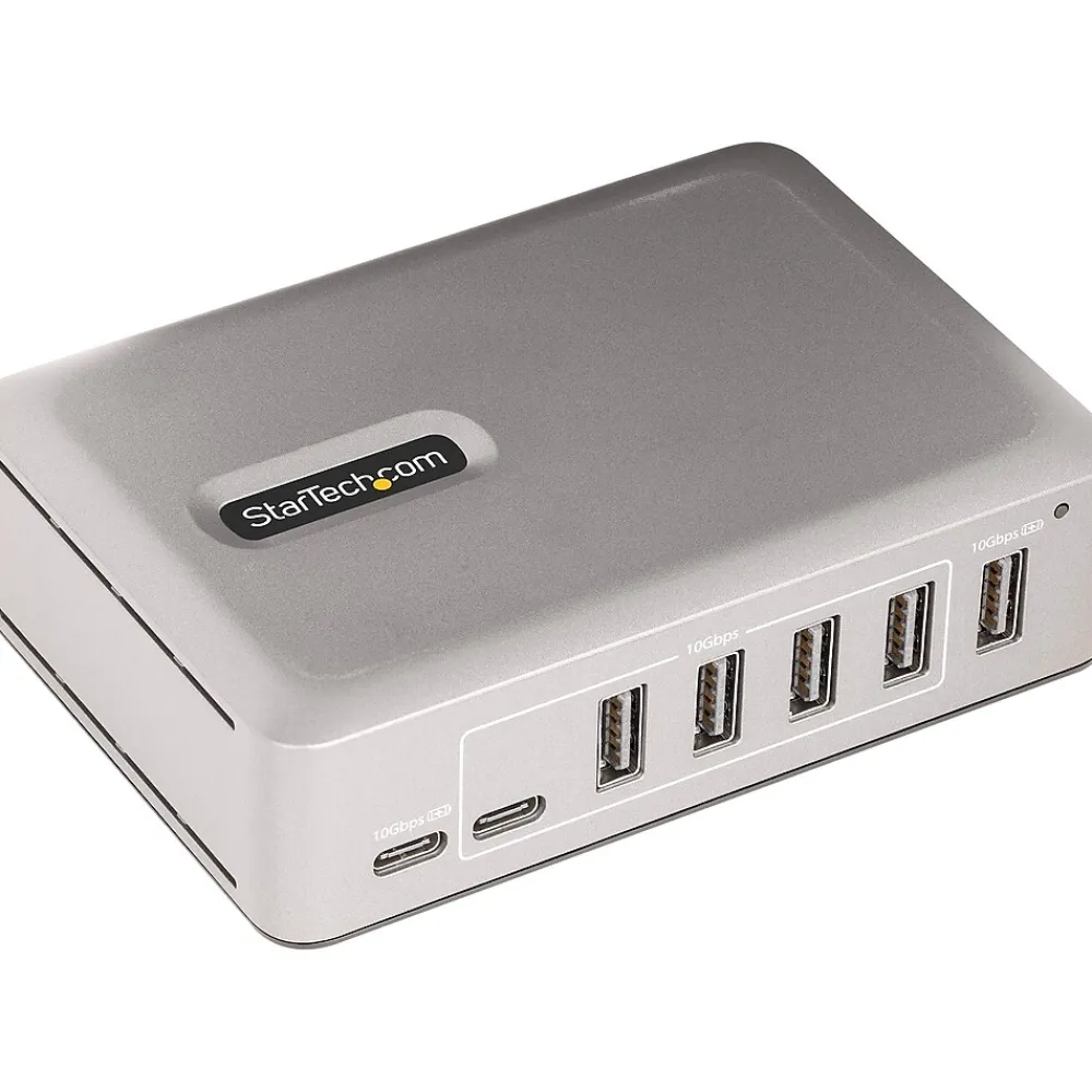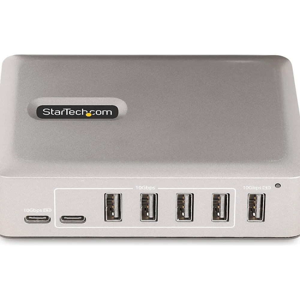 Add seven USB 3.2 Gen 2 (10Gbps) ports (5x USB-A, 2x USB-C) to a USB-C computer using this StarTech 7-Port USB-C hub. The USB hub is self-powered with an included power adapter. The USB hub features Overcurrent Protection (OCP). OCP aids in preventing peripherals from overdrawing power, avoiding USB device dropouts, and the computers from shutting down unexpectedly. Support for Wake On USB enables USB communications, from devices connected to the hub, to take the computer out of standby or other power saving/sleep modes.