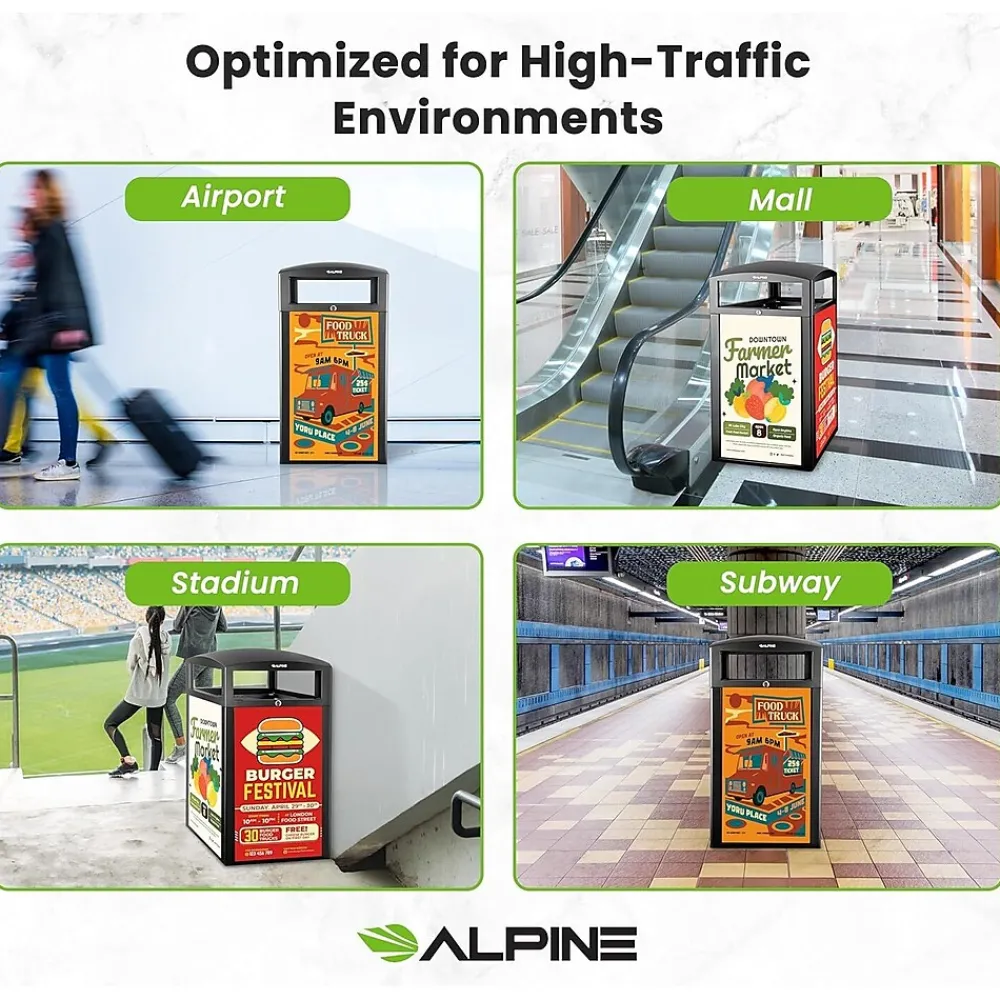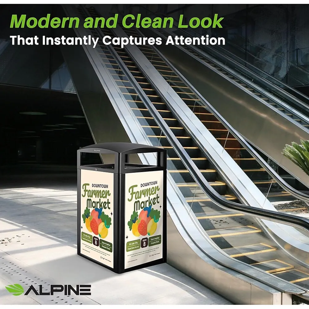 When equipping your business’s exterior with waste receptacles, you want to be reassured that it will last in the harshest weather conditions but is also aesthetically pleasing. With this Alpine rugged 40 gal. all-weather trash container with advertisement panels, you can check off both qualities and advertise while keeping your grounds well-equipped.