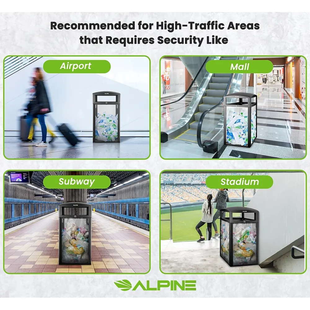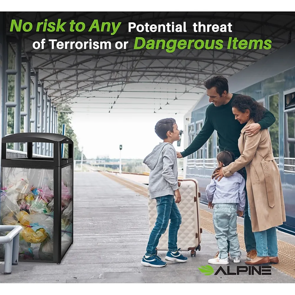 Alpine designed this DHS-compliant 40 gal. waste receptacle with transparent panels that provides security, durability, and visual appeal. To provide clear visibility to the contents of the trash can, Alpine has made the panels transparent. Law enforcement, protective services, and maintenance staff can see what’s inside and how full the can is. The dome-shaped lid prevents heavy items from being rested on top of it. The affixed lock on the lid prevents tampering, vandalism, and large objects from being inserted into the trash can. The lid’s heavy-duty hinge with attached safety chains controls how far back it can be opened. Inside are two metal clips located on both sides to securely hold your trash bags in place, even when filled. Since surfaces may be uneven, resulting in a tilted waste receptacle, Alpine has included adjustable legs that allow you to customize the height of each leg. Thanks to the substantially sized 40 gal. all-weather trash container, you can service a greater volume of foot traffic. This trash receptacle is vital to keeping your facilities clean in conjunction with elevating your aesthetic and maintaining safety for your passengers. It’s a no-brainer to outfit your commuter rail and subway systems with Alpine’s trash container with all these fantastic features.