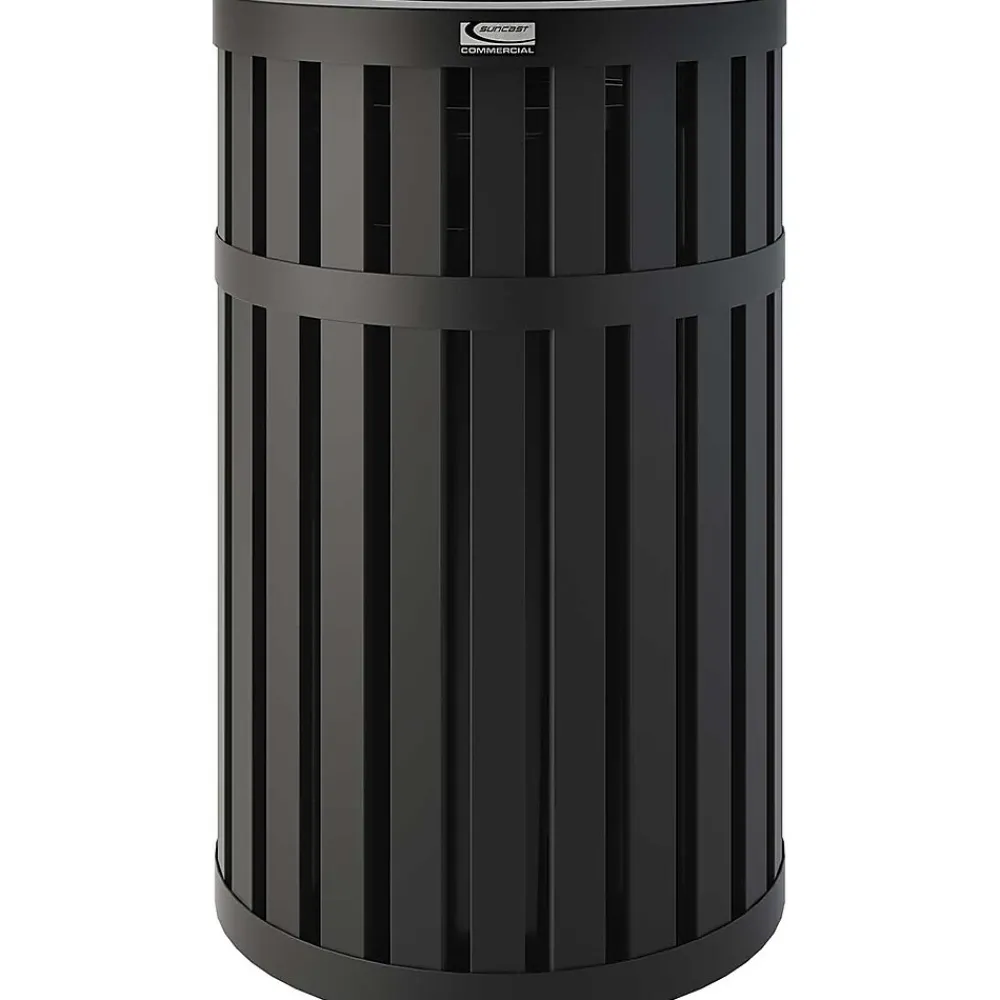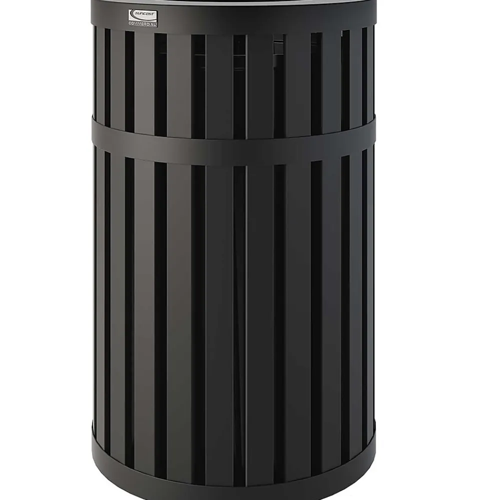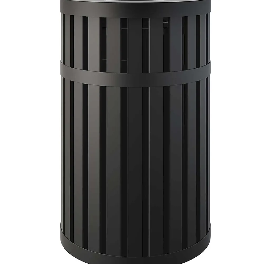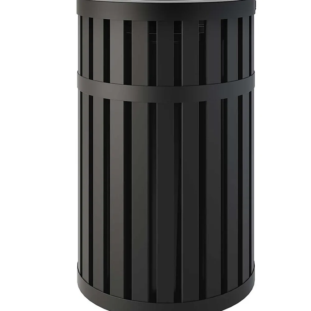 The 45 gallon round slatted metal trash can with canopy lid, is constructed of durable steel. This can comes fully assembled, including a round, high-density polyethylene liner, for easy waste removal. With a slatted design that has a powder coat finish, this can is weather resistant, making it perfect for indoor or outdoor environments.