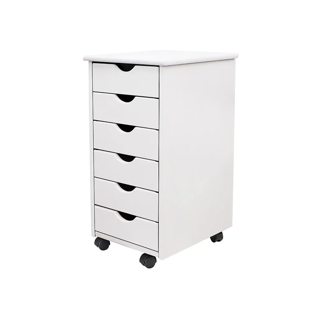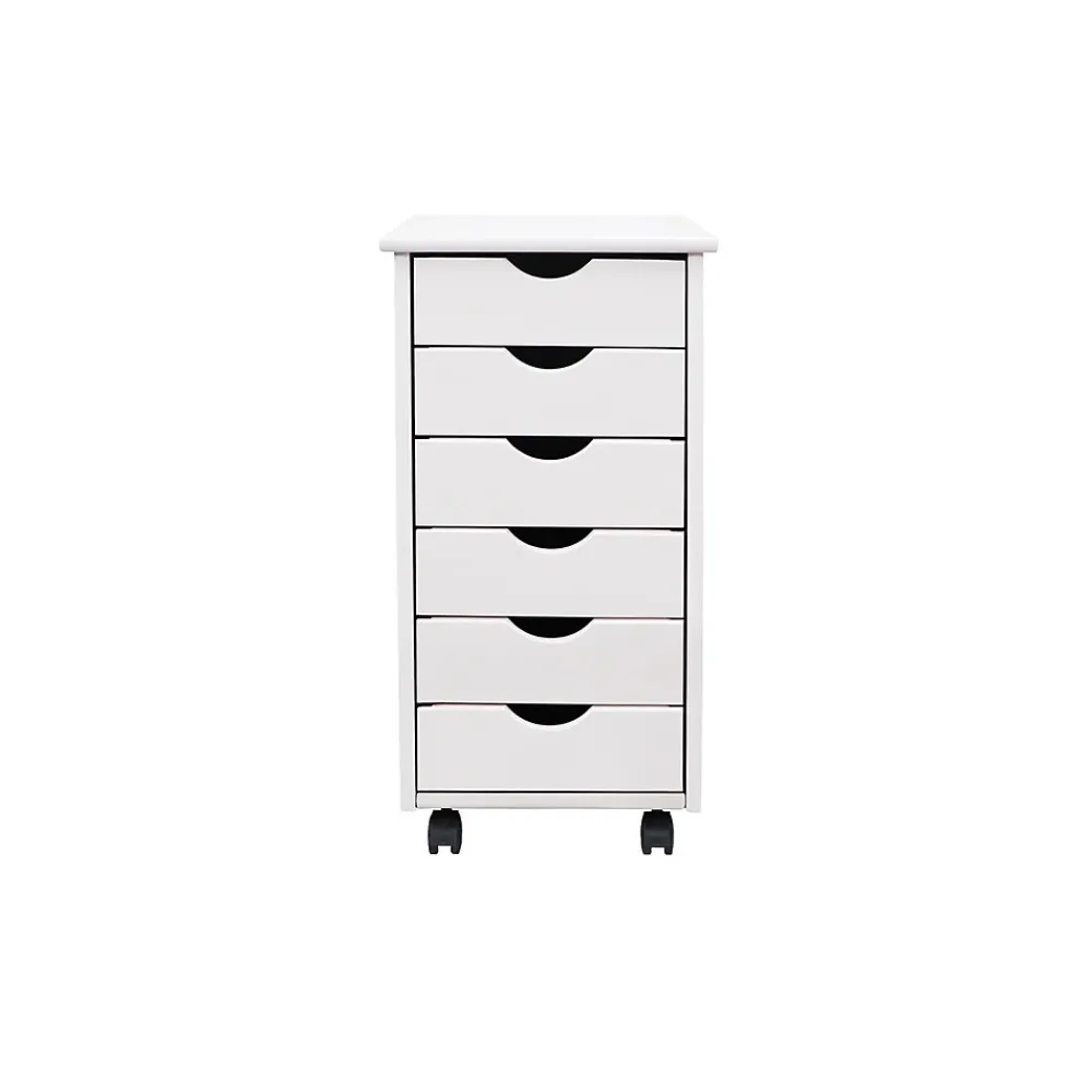 This six-drawer roll cart on wheels features deep drawers to hold reams of paper or drills. Perfect for project rooms, kitchens, garages, offices, or end tables.