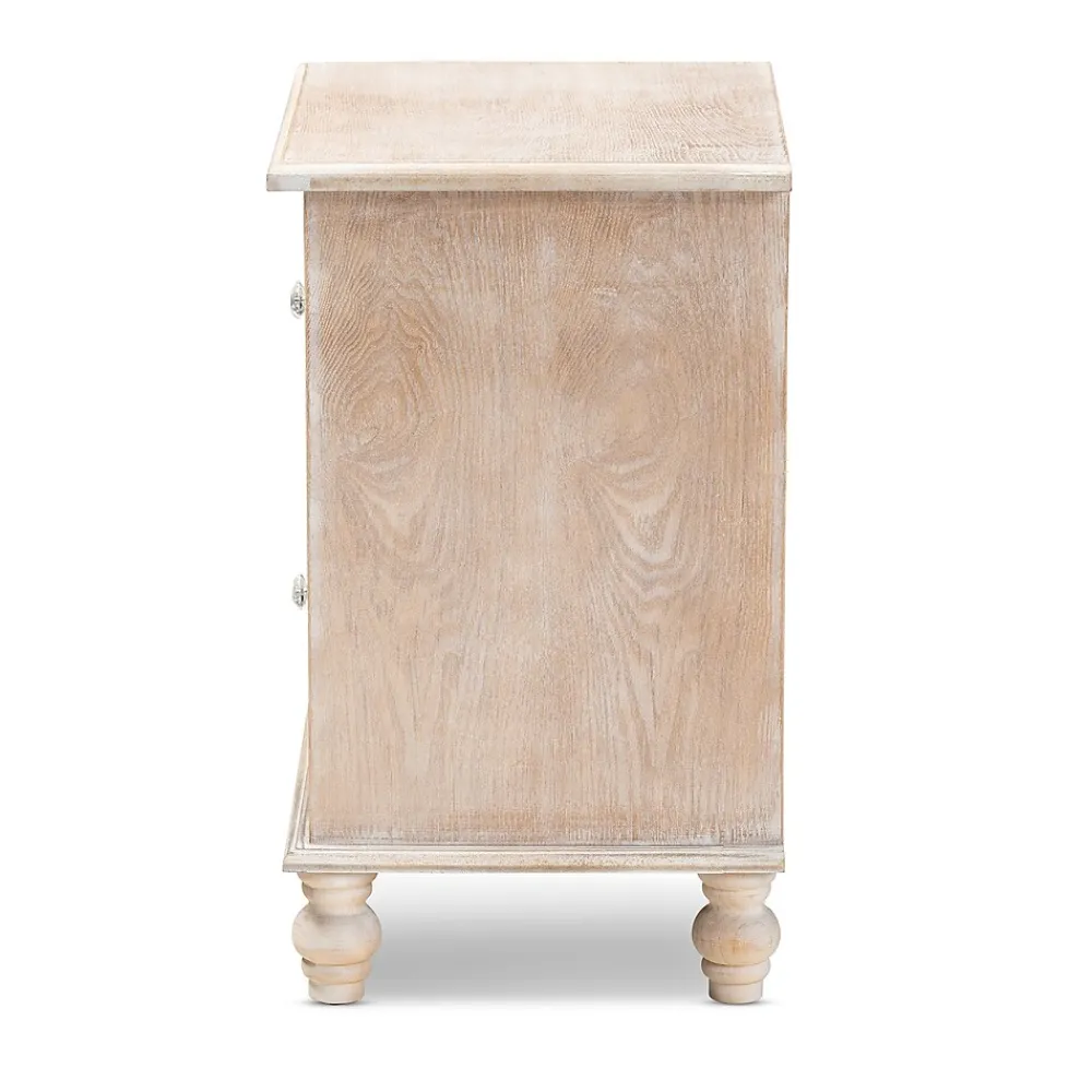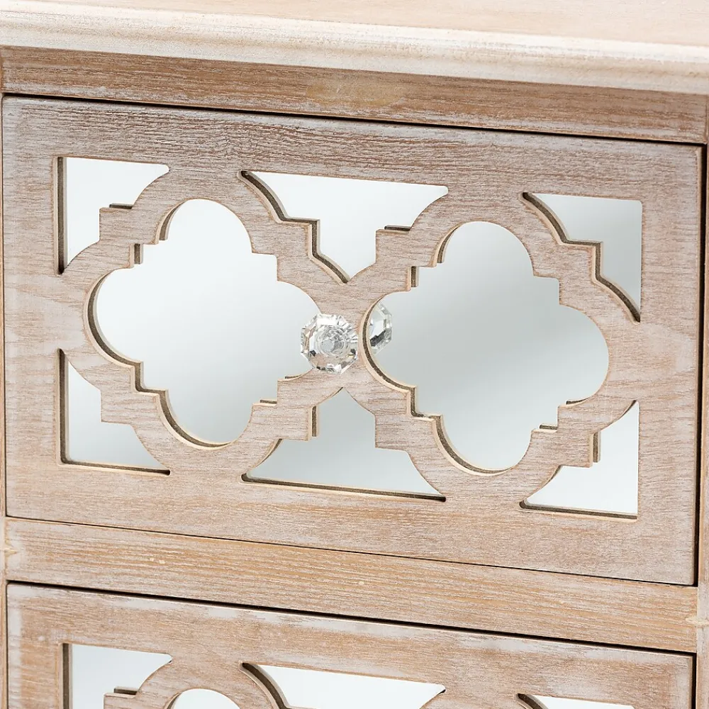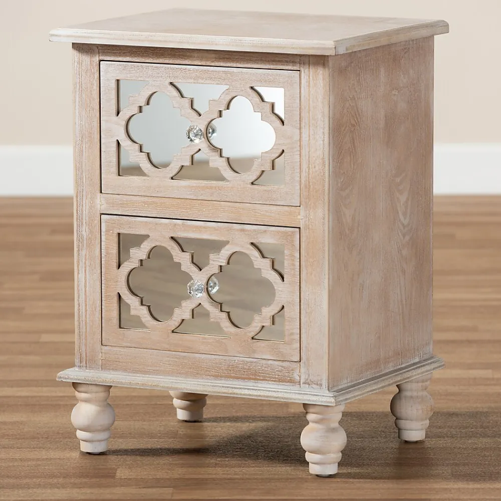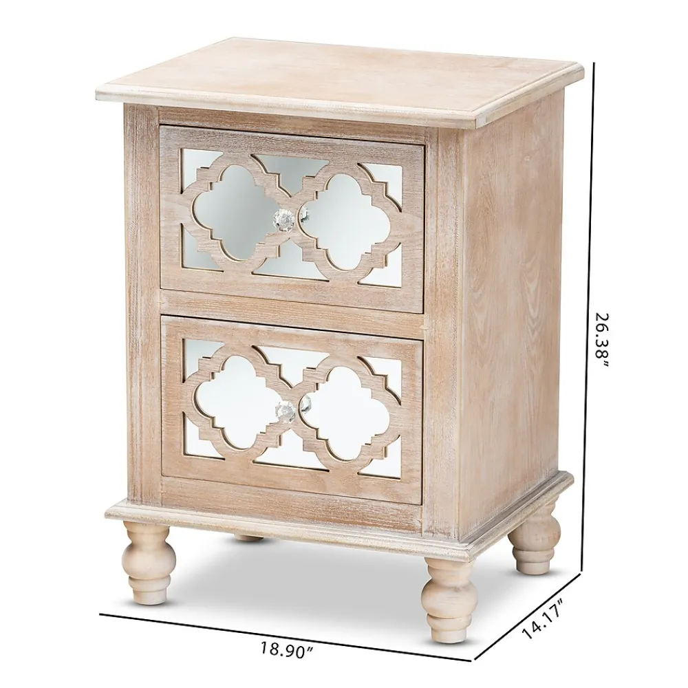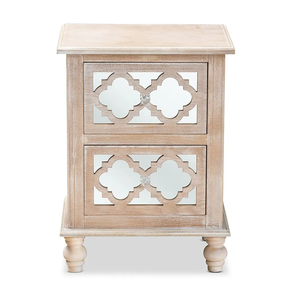 A unique mix of rustic and glam makes the Celia nightstand a chic bedside companion. This wood nightstand displays a white-washed oak finish for an aged, vintage look. Two drawers provide ample space to store all the bedroom essentials. Mirrored glass adds a hint of glamour and highlights the elegant quatrefoil pattern layover. Crystal knobs and turned feet add an extra dose of charm. The Celia nightstand is made in China and will arrive fully assembled.