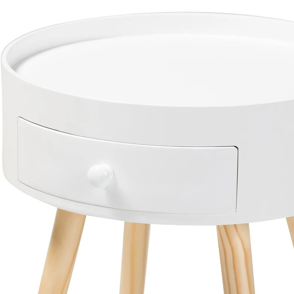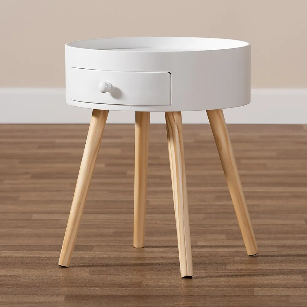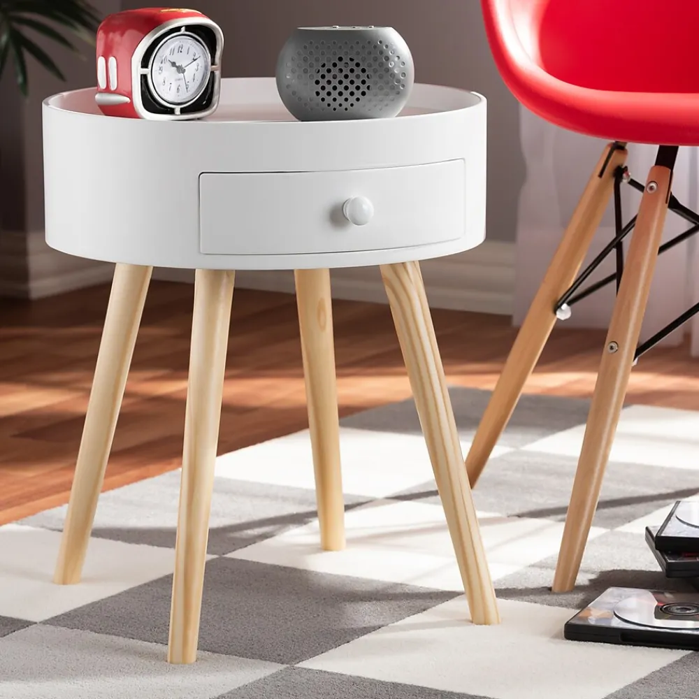Add cool, quirky style to your bedroom with the Jessen nightstand. The Jessen features a tray-style top, ideal for keeping phones and other items secure. One drawer, fitted with a round knob, provides space to store bedside essentials. Functional and stylish, the Jessen showcases a sleek neutral finish that is complimentary to a wide range of color palettes. Angled wood legs add a stylish mid-century feel. The Jessen nightstand is made in China and requires assembly.