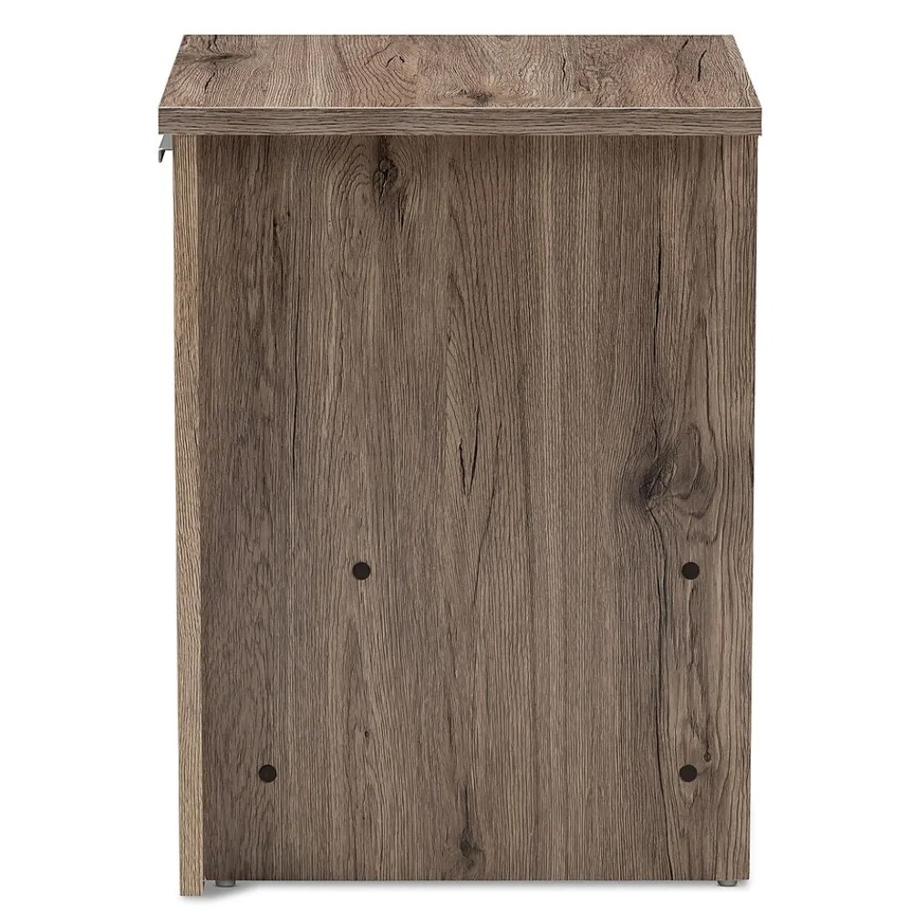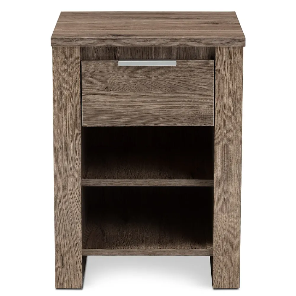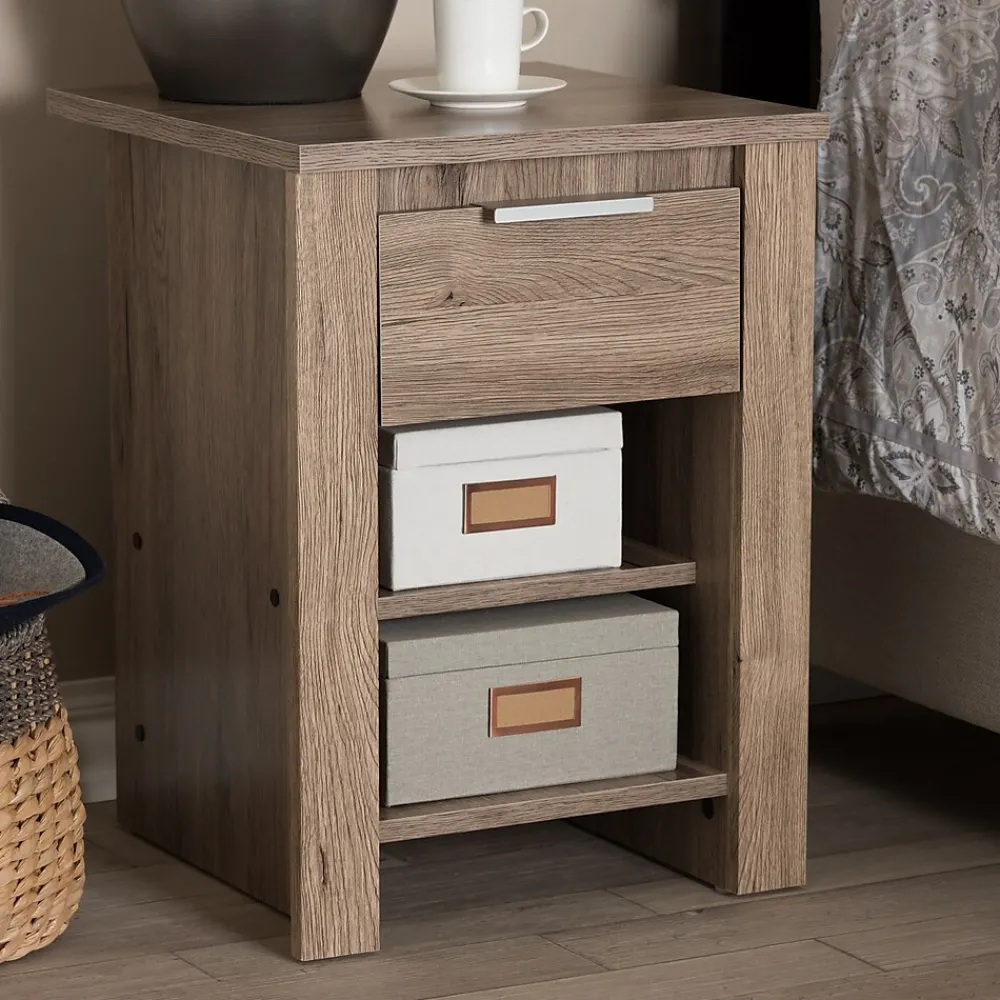 The Laverne nightstand is an essential piece of furniture that is both charming and simple. The modern and contemporary-inspired design is exemplified in the rectangular, geometric silhouette. The Laverne is finished in a natural oak brown to give you a hint of rustic and natural vibes. The nightstand features a convenient top drawer, which rolls out smoothly on slides. The Laverne also features two open shelves beneath the top drawer. The minimalist nightstand with its neutral coloring, will be easy to coordinate with the decor in your bedroom or guest room. The Laverne can even serve as additional storage in your entryway, living room, or closet. Made in Malaysia, the nightstand requires assembly.