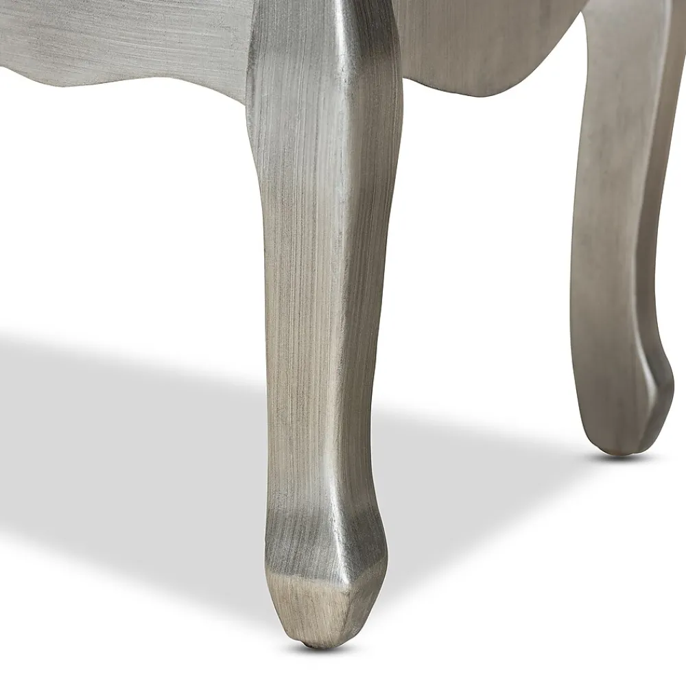 With its stunning metallic tones, the Leonie nightstand brings a touch of glamour to any bedroom. This sturdy wood nightstand displays a brushed silver finish that gives a cool, contemporary update to its classic French-inspired silhouette. Two drawers provide space to store all the bedside essentials. Mirrored glass on the drawers and tabletop magnificently capture and reflect the surrounding light within the room. Crystal knobs and cabriole legs lend an extra touch of glam. The Leonie nightstand is made in China and will arrive fully assembled.