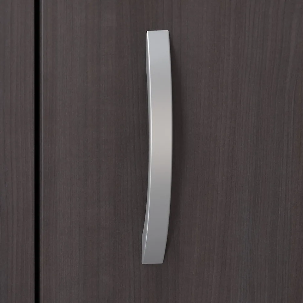 - Brushed Nickel hardware complements the White or Storm Gray finish to complete the contemporary look