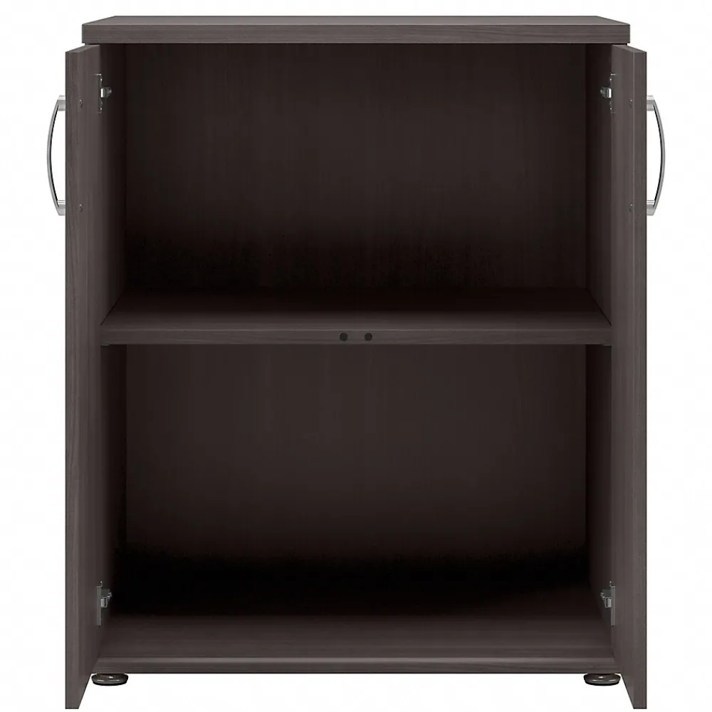 The Bush Business Furniture Universal floor storage cabinet with doors and shelves features a commercial-quality design and contemporary styling that suits virtually any home or professional environment. Organize your office, break room, garage, laundry room, or any other work or living space with an accent cabinet that’s built to last and boasts plenty of practical storage capacity. Cabinet doors with smooth Euro-style hinges open to reveal one fixed shelf and one adjustable shelf that accommodate office supplies, books, tools, and household items of various sizes. Each shelf supports up to 50 lbs., so storing larger materials is no problem. The floor cabinet’s base includes adjustable levelers to compensate for uneven surfaces. This two-door storage cabinet has been tested to meet ANSI/BIFMA quality standards for safety and performance and is backed by a 10-year manufacturer warranty.