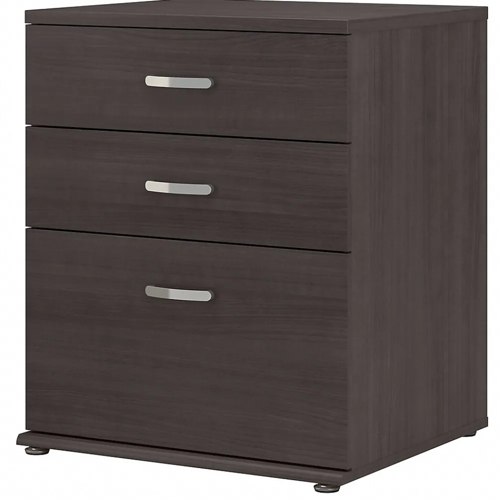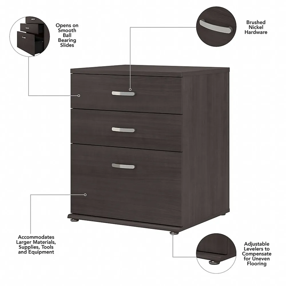 The Bush Business Furniture Universal floor storage cabinet with drawers features a commercial-quality design and contemporary styling that suits virtually any home or professional environment. Organize your office, break room, garage, laundry room, or any other work or living space with an accent cabinet that’s built to last and boasts plenty of practical storage capacity. Drawers can hold up to 30 lbs. each and open on smooth full-extension ball bearing slides for an effortless reach to office supplies, tools, household items, and more. The spacious bottom drawer easily accommodates larger materials and equipment. The floor cabinet’s base includes adjustable levelers to compensate for uneven surfaces. This three-drawer cabinet has been tested to meet ANSI/BIFMA standards for safety and performance and is backed by a 10-year warranty. See the full collection for coordinating items available.