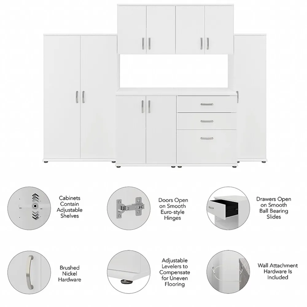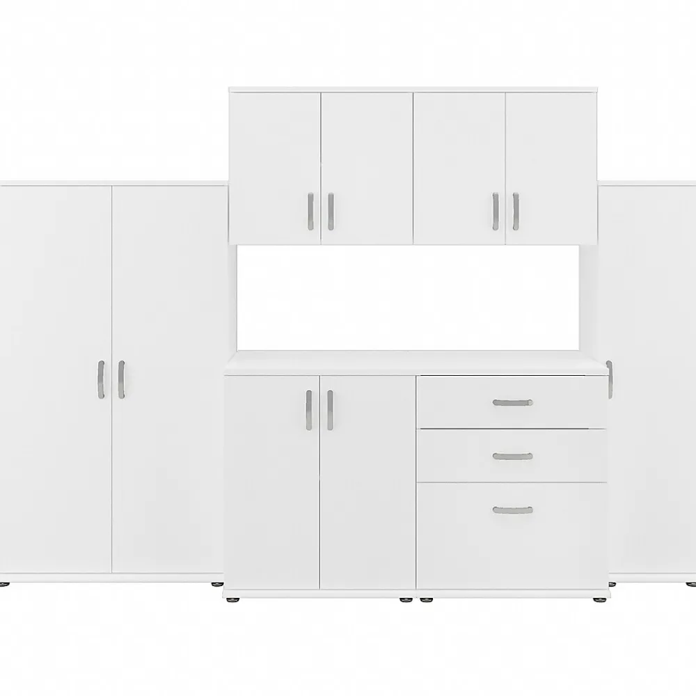 - Bundle includes: tall storage cabinet with doors, tall narrow storage cabinet, floor storage cabinet with doors, floor storage cabinet with drawers, set of two wall cabinets with doors