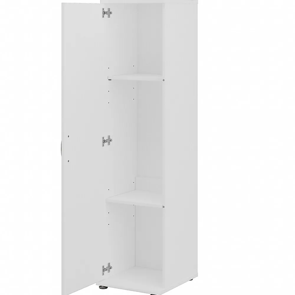 The Bush Business Furniture Universal 108″W six-piece modular storage set with floor and wall cabinets features commercial-quality designs and contemporary styling that suits virtually any home or professional environment. Organize your office, break room, garage, laundry room, or any other work or living space with storage furniture that’s built to last and offers plenty of room for supplies, materials, and equipment. The floor storage cabinet with doors, tall storage cabinet, and tall narrow storage cabinet combine fixed and adjustable shelving to accommodate items of various sizes. Two wall-mounted cabinets also contain one fixed and one adjustable shelf each for flexible, space-saving storage. Additional tools and supplies can be stashed inside the three-drawer cabinet. This cabinet set has been tested to meet ANSI/BIFMA standards for safety and performance and is backed by a 10-year warranty.