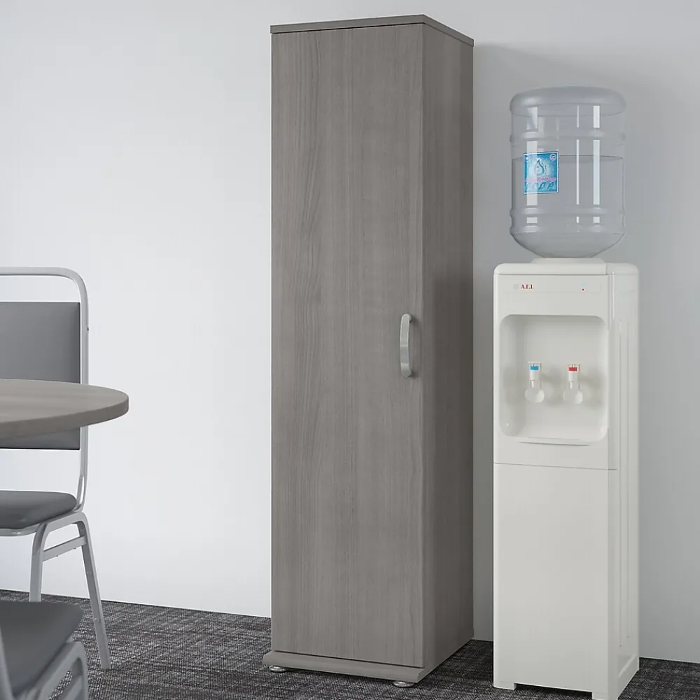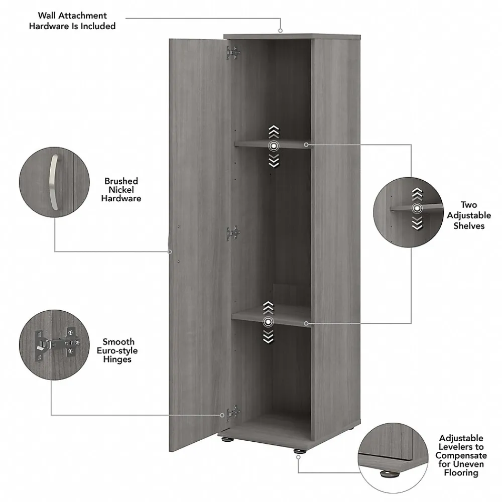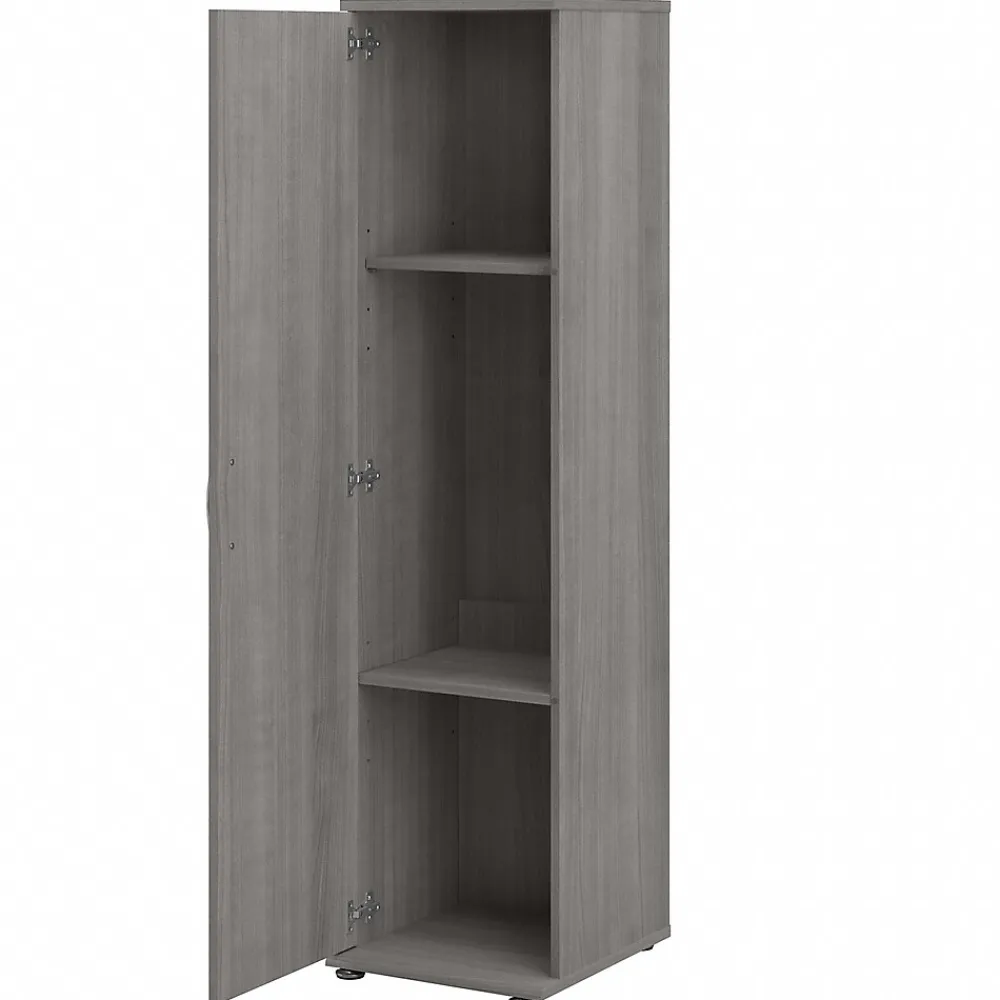 The Bush Business Furniture Universal tall narrow storage cabinet with door and shelves features a commercial-quality design and contemporary styling that suits virtually any home or professional environment. Organize your office, break room, garage, laundry room or any other work or living space with a tall skinny cabinet that’s built to last and boasts plenty of storage capacity. The door opens to reveal one fixed shelf and two adjustable shelves for flexible storage of office supplies, tools, household items, and more. Each shelf supports up to 35 lbs., so storing larger materials and equipment is no problem. The floor cabinet’s base has adjustable levelers to compensate for uneven surfaces, and wall attachment hardware is included for maximum stability. This tall narrow cabinet has been tested to meet ANSI/BIFMA standards for safety and performance and is backed by a 10-year warranty.