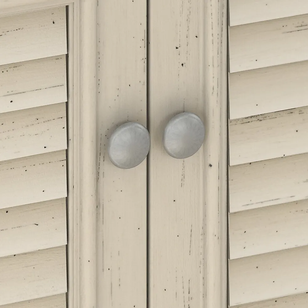 With its practical design and casual appearance, the Bush Furniture Fairview Small Storage Cabinet with Doors offers a versatile solution to organizing your home. A slightly weathered finish with Antique Pewter hardware invokes the welcoming charm of modern farmhouse style, while a durable build and functional features ensure long lasting appeal. The low profile design works well in small spaces while still providing ample storage, making this accent cabinet a good fit for any room. Elegant louvered doors on Euro style hinges open to reveal 3 shelves, 2 of which can be adjusted to hold items of different sizes. The top of the 2 door Storage Cabinet offers a sturdy surface with enough space to display your favorite trinkets and mementos. This organizer has been tested to meet ANSI/SOHO standards for safety and performance and is backed by the Bush Furniture 6 Year Manufacturer’s Warranty.