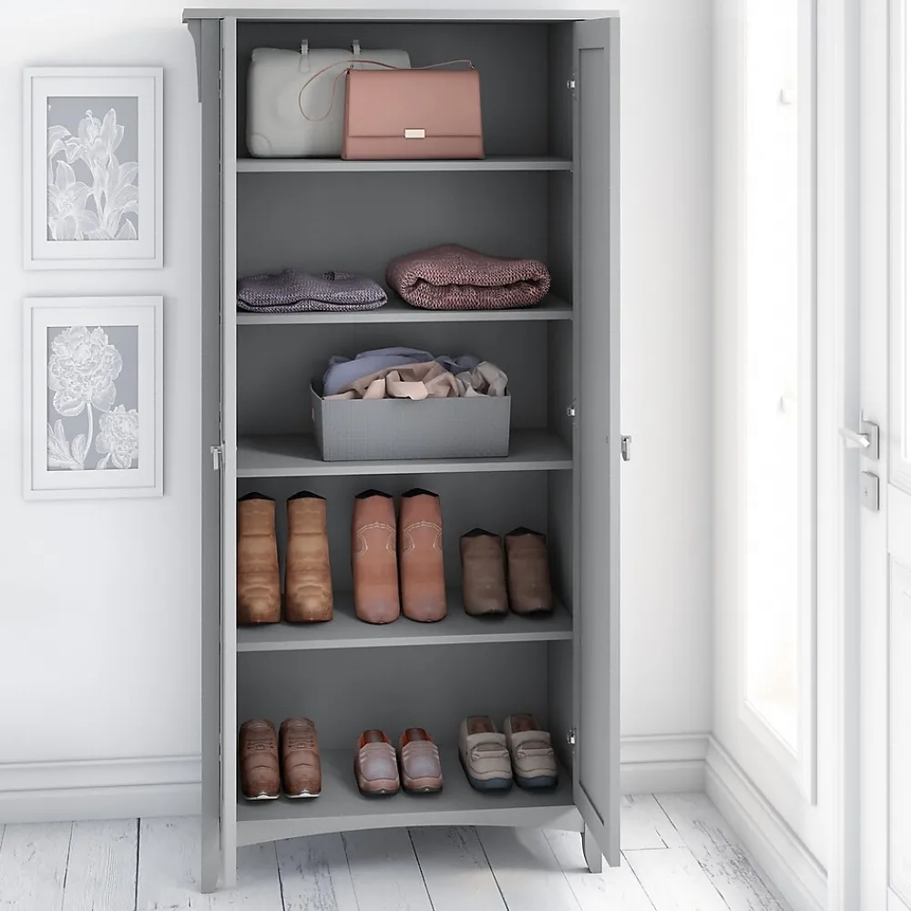 Organize your home with an accent cabinet that combines casual style with a convenient, versatile design. The Bush Furniture Salinas tall storage cabinet with doors features five concealed shelves for keeping miscellaneous household items, office supplies and entertainment essentials in order and out of sight. Three adjustable shelves can be moved up or down to accommodate bulky items like binders and photo albums while the two remaining shelves are fixed for stability.