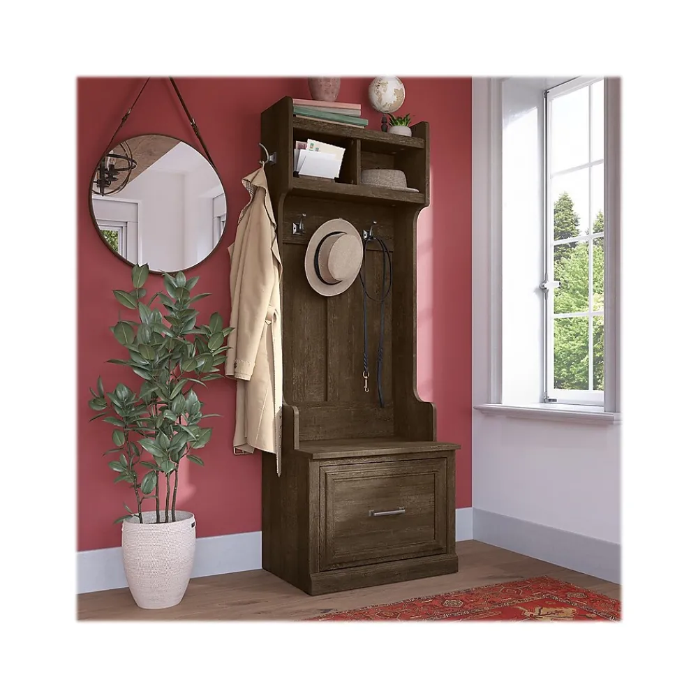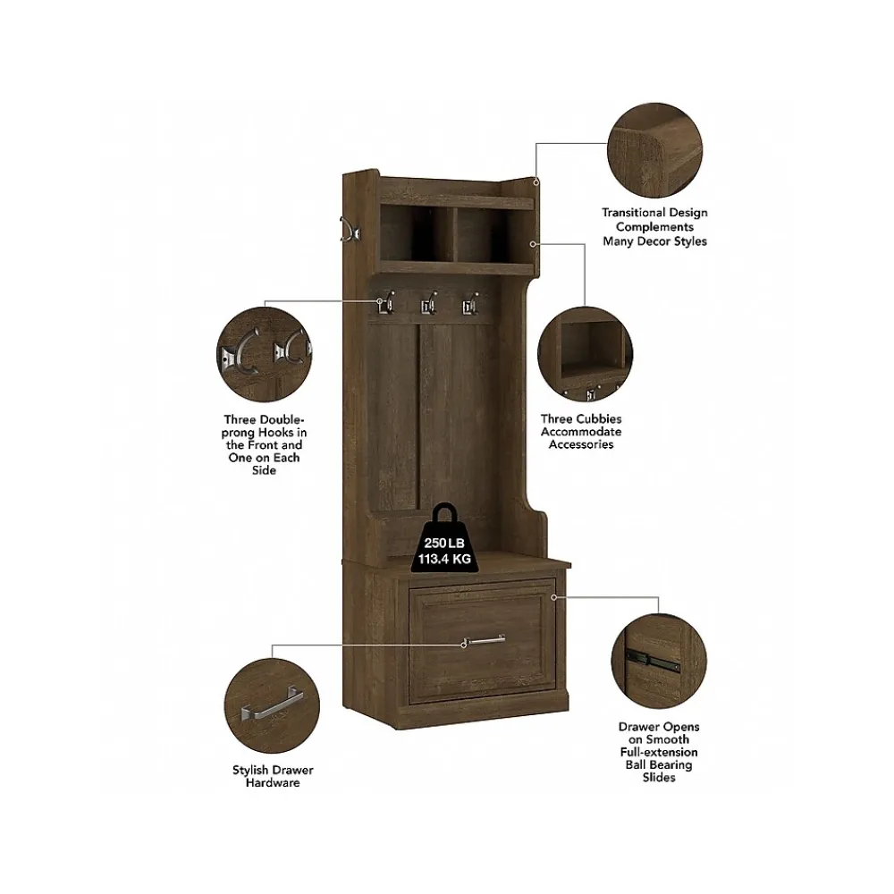 The Bush Furniture Woodland 24W Hall Tree and Small Shoe Bench with Drawer combines transitional styling and a practical design to offer an ideal entryway organizer. Have a seat on the durable bench and take a moment to relax as you get ready to head out the door or come home after a long day. The top of the mudroom bench supports 250 pounds, so you can sit down to put on and take off your shoes or set bags down with confidence. A small drawer opens on smooth ball bearing slides for easy access to footwear and accessories. The narrow Hall Tree features three coat hooks in the front and one on each side for hanging jackets, hats, and more. Smaller items like gloves and keys can be stashed inside two open compartments. This entryway bench with storage has been rigorously tested to meet Bush Furniture’s standards for safety, performance and durability and is backed by a 3 Year Warranty.