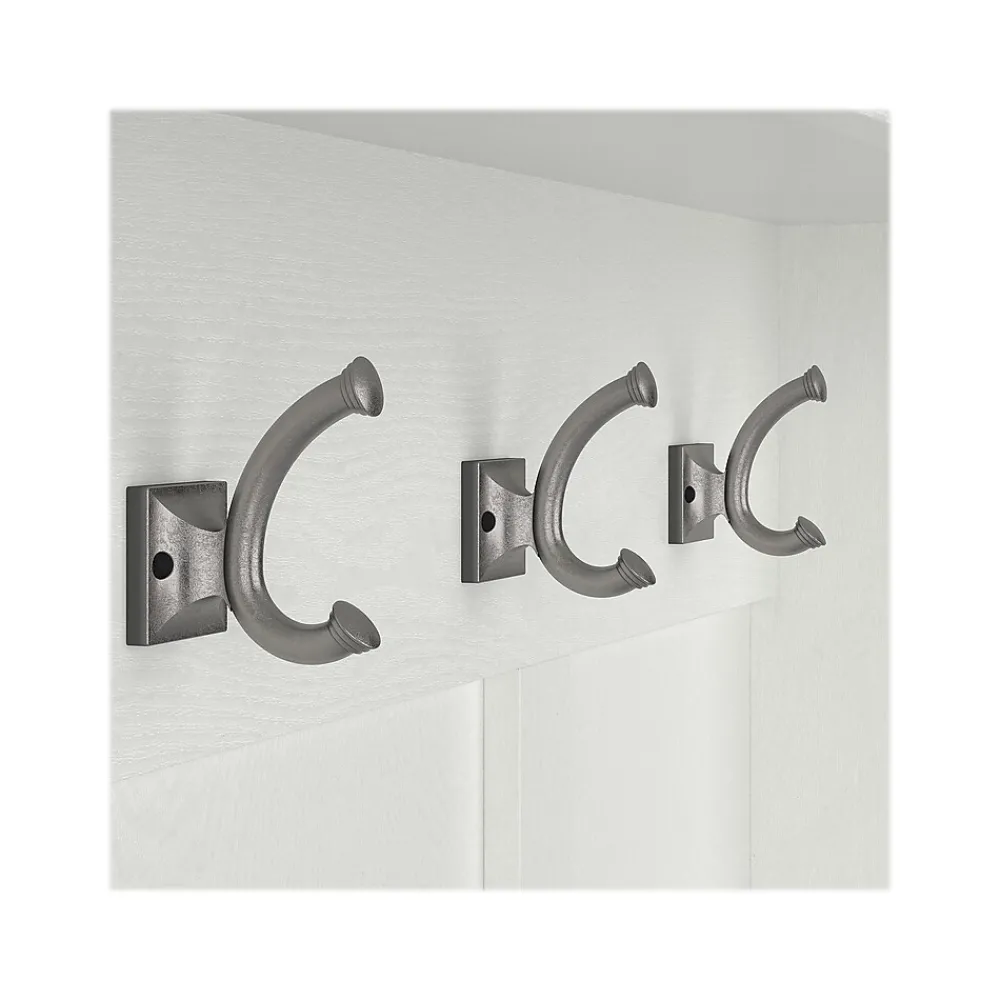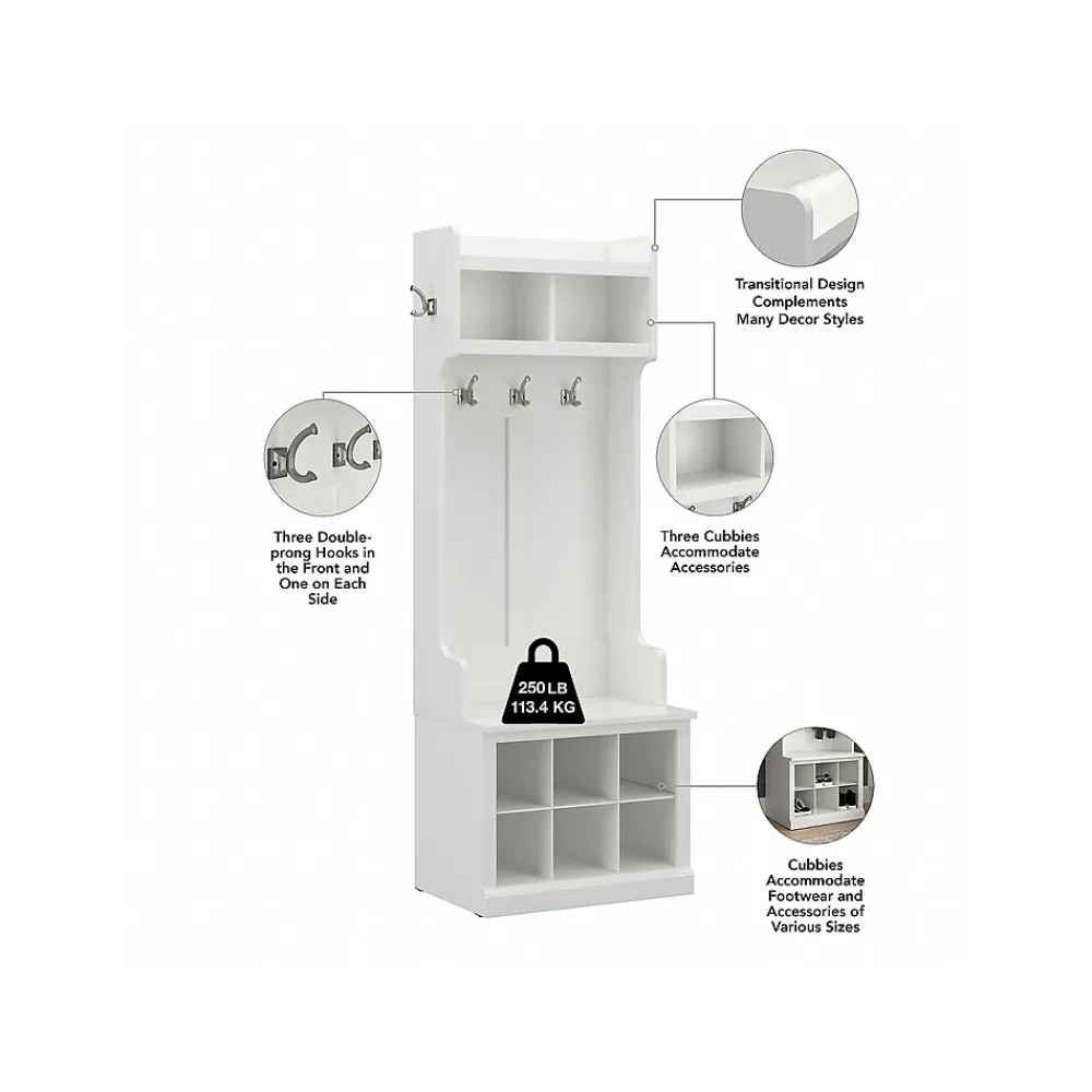 The Bush Furniture Woodland 24W Hall Tree and Small Shoe Bench with Shelves combines transitional styling and a practical design to offer an ideal entryway organizer. Have a seat on the durable bench and take a moment to relax as you get ready to head out the door or come home after a long day. The top of the mudroom bench supports up to 250 pounds, so you can sit down to put on and take off your shoes or set bags down with confidence. Six built-in cubby spaces keep your home organized while providing easy access to footwear. The narrow Hall Tree features three coat hooks in the front and one on each side for hanging jackets, hats, and more. Smaller items like gloves and keys can be stashed inside two open compartments. This entryway bench with storage has been rigorously tested to meet Bush Furniture’s standards for safety, performance and durability and is backed by a 3 Year Warranty.