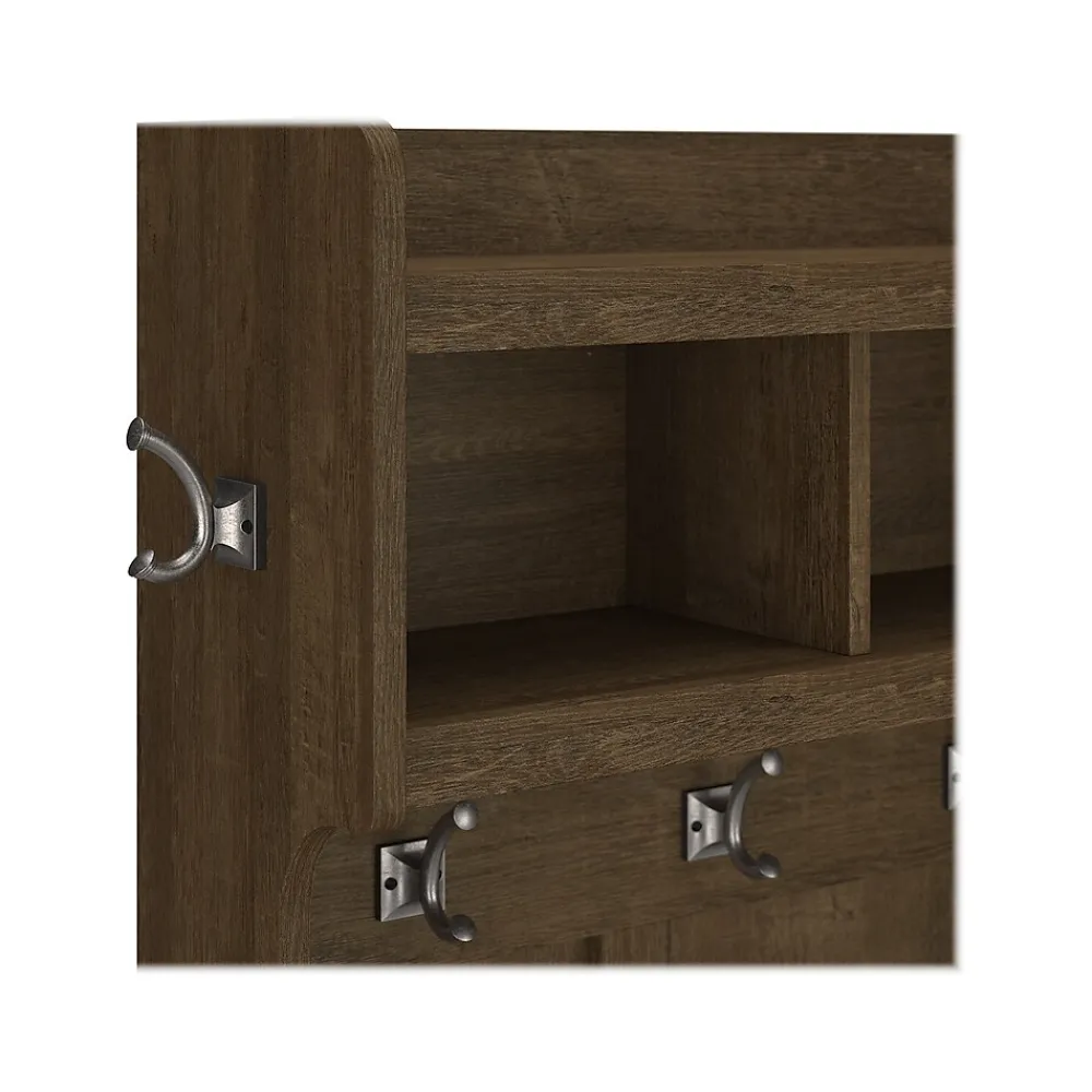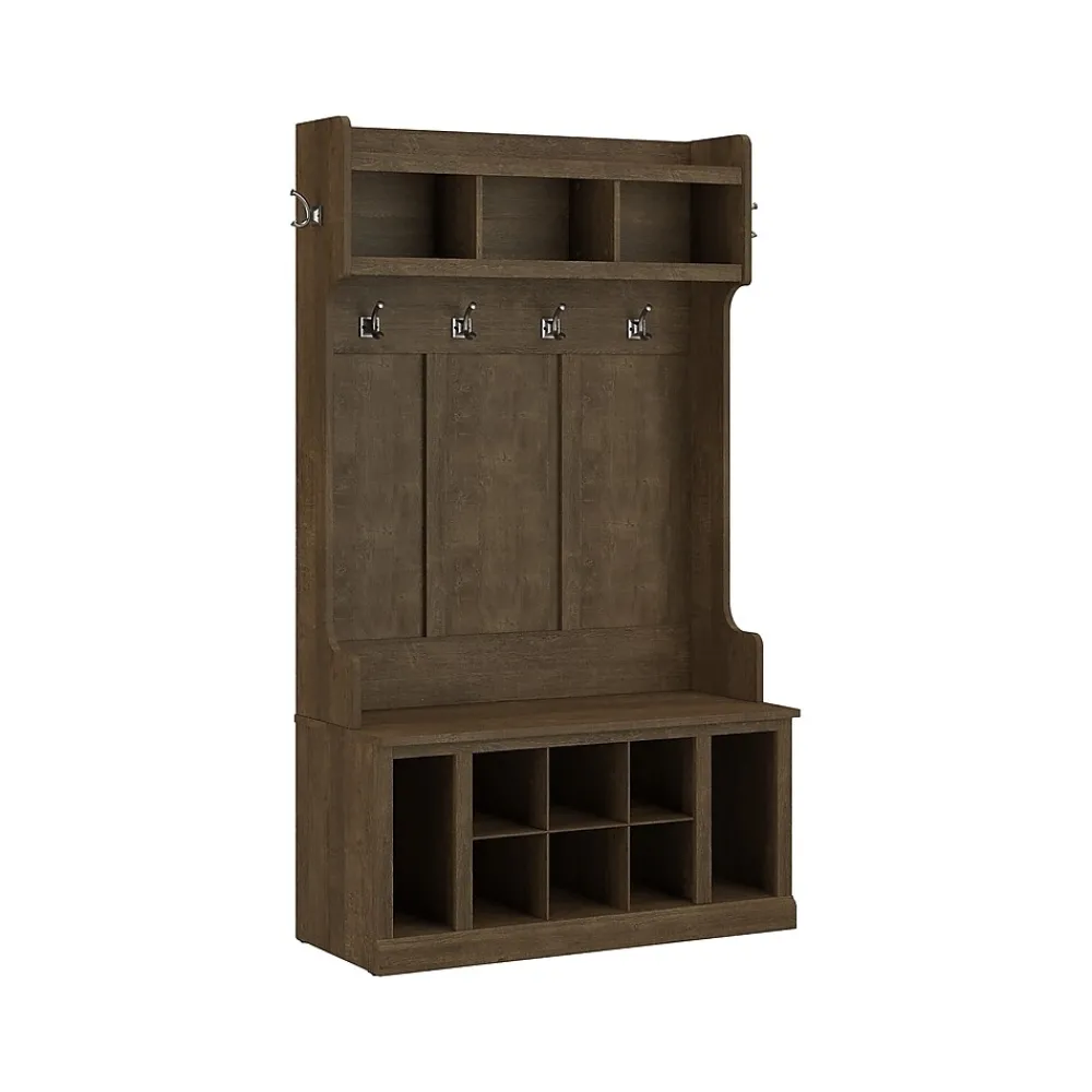 The Bush Furniture Woodland 40W Hall Tree and Shoe Storage Bench with Shelves combines transitional styling and a practical design to offer an ideal entryway organizer. Have a seat on the durable bench and take a moment to relax as you get ready to head out the door or come home after a long day. The top of the mudroom bench supports 250 pounds, so you can sit down to put on and take off shoes or set bags down with confidence. Six cubby spaces and vertical shelves on either side keep footwear of all shapes and sizes in order. The Hall Tree has four coat hooks in the front and one on each side for hanging jackets, hats, scarves and more. Smaller items like gloves and keys can be stashed inside three open compartments. This entryway bench with storage has been rigorously tested to meet Bush Furniture’s standards for safety, performance and durability and is backed by a 3 Year Warranty.