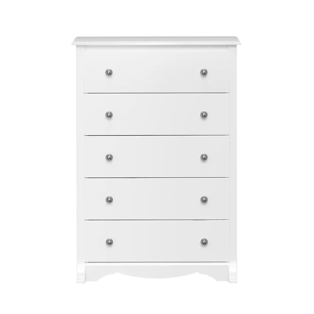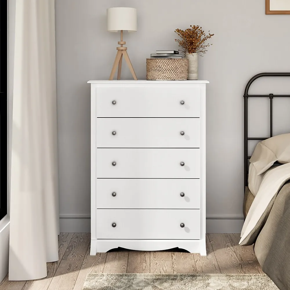 Prepac Monterey 5-drawer chest in white finish is constructed from CARB-compliant laminated composite woods which give an elegant look to any room. Drawer chest has a sturdy top to pile on your books, cell phone, alarm clock, lamp and more.