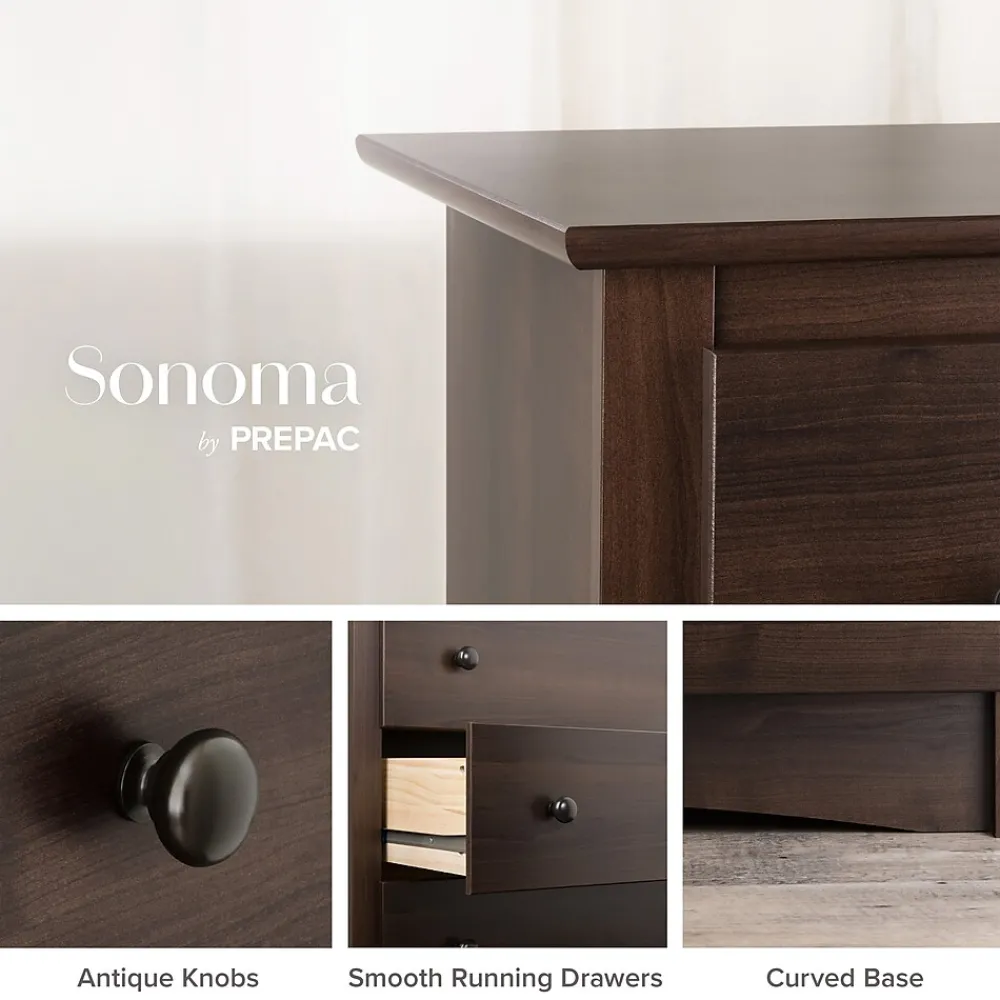 Prepac 5-Drawer chest in espresso finish is constructed from CARB-compliant laminated composite woods which give an elegant look to any room. Drawer chest has a sturdy top to pile on your books, cell phone, alarm clock, lamp and more.