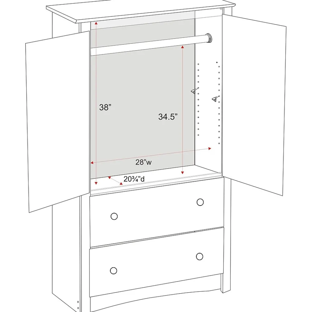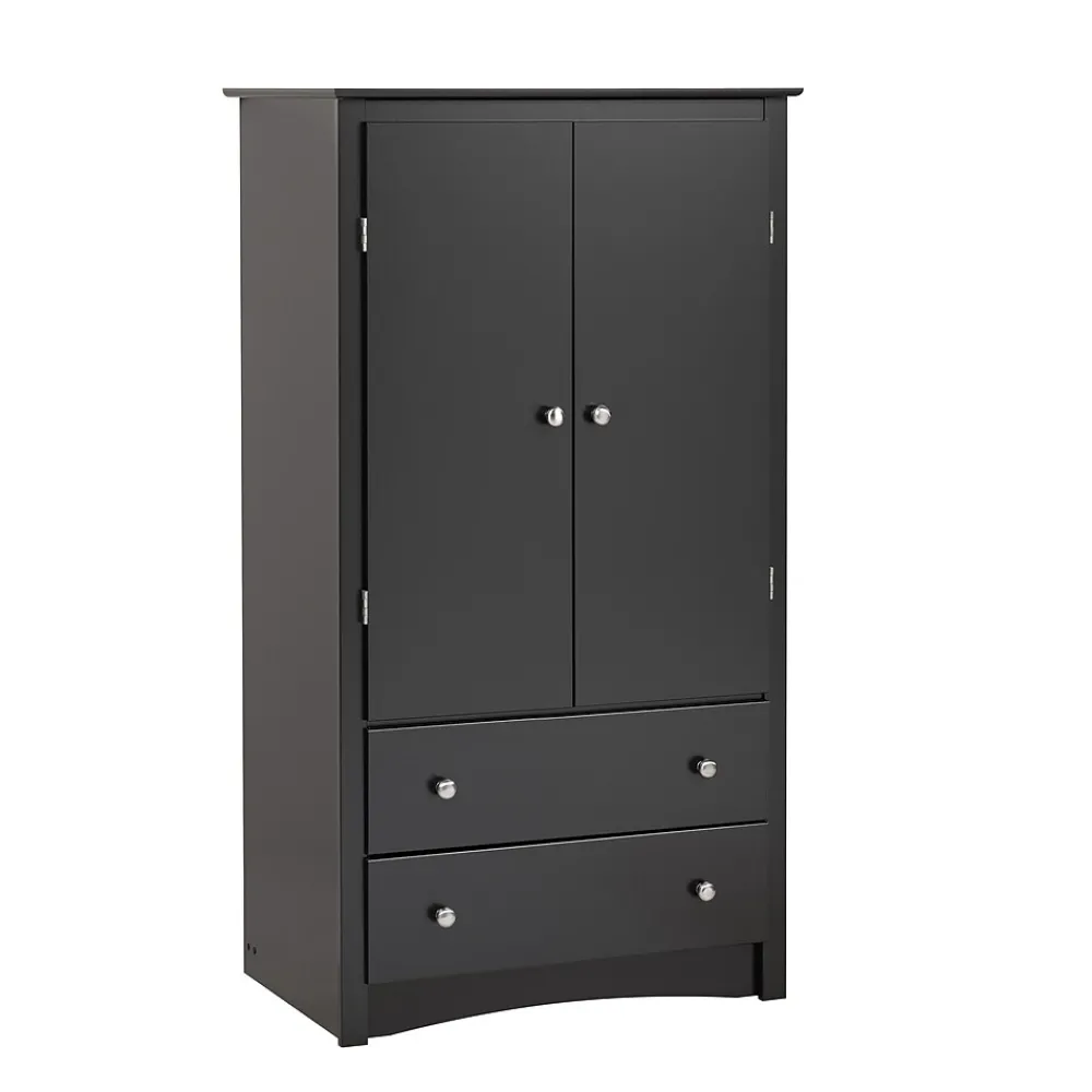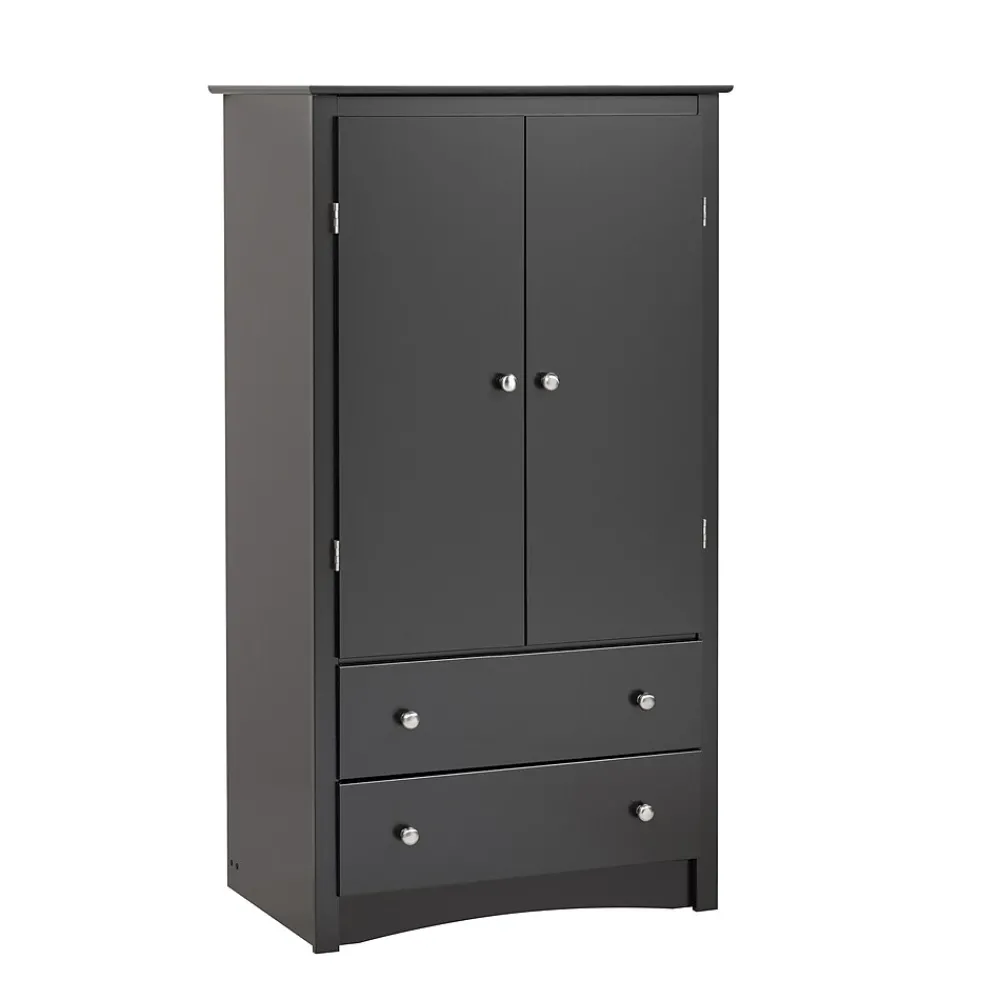 Prepac™ 2 Door armoire in black finish is constructed from CARB-compliant laminated composite woods which give an elegant look to any room. Drawer chest has a sturdy top to pile on your books, cell phone, alarm clock, lamp and more.